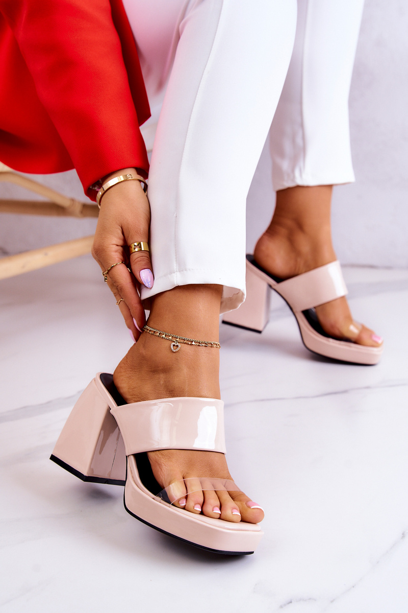Klapki Lakierowane Obcas Słupek Jasnobeżowe Seattle
