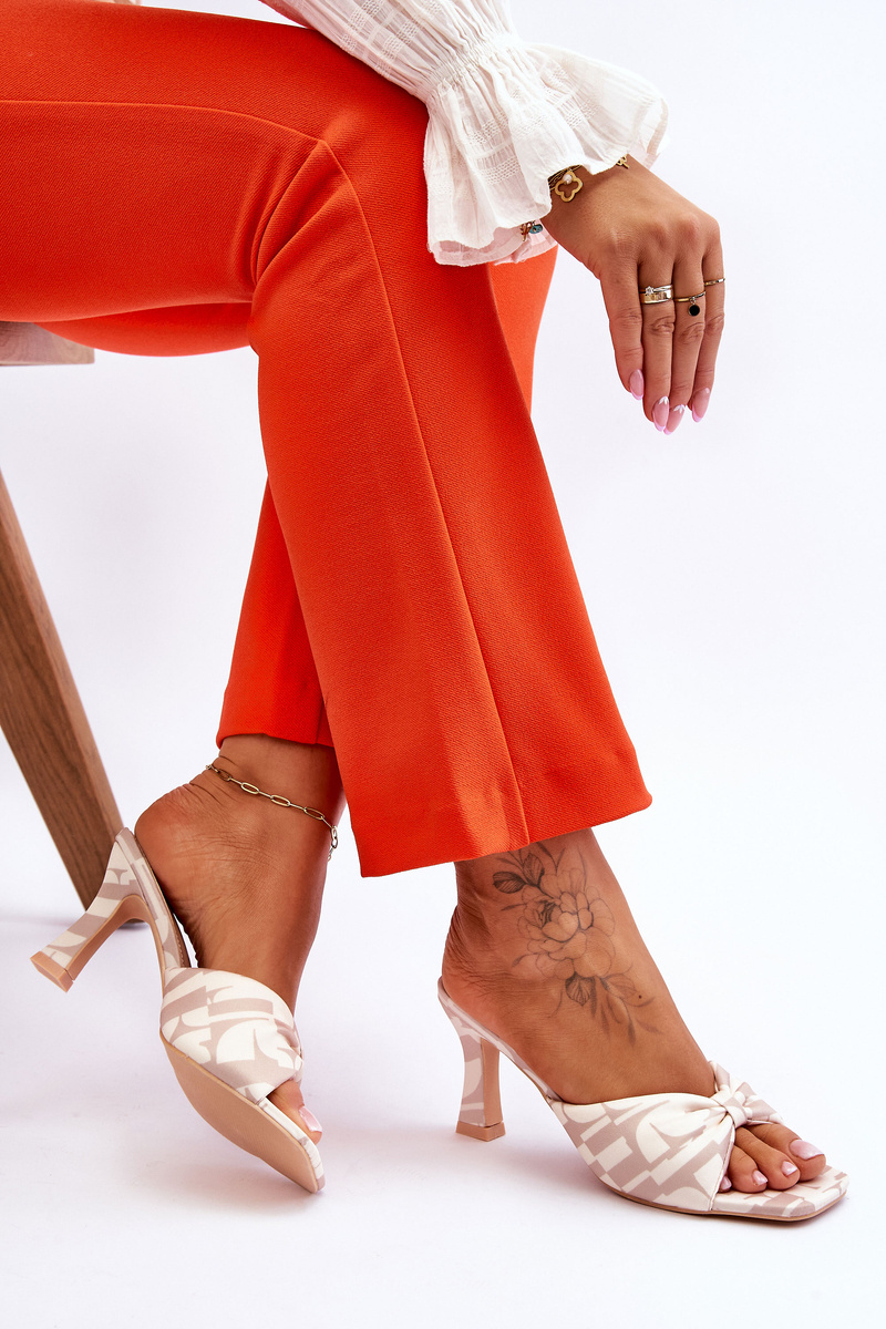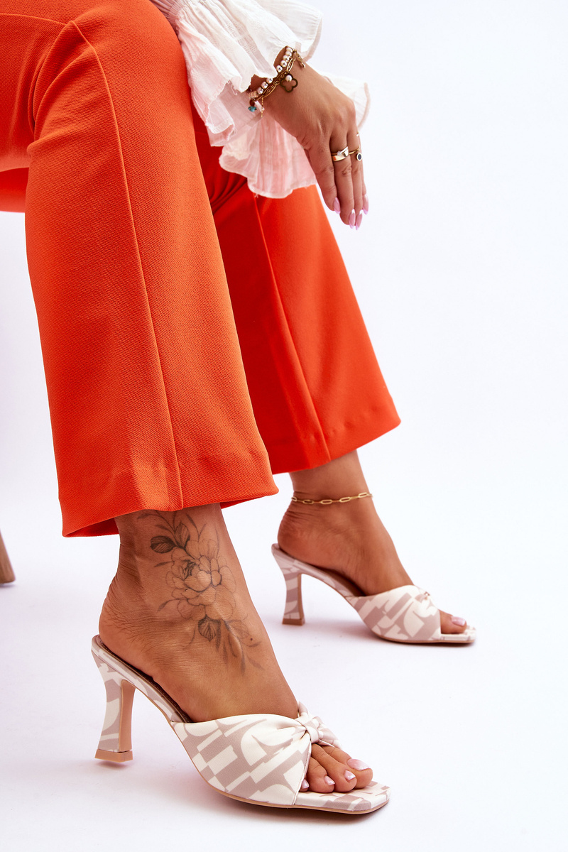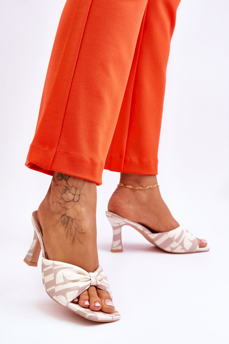 Klasyczne klapki o modnym fasonie pasują do wielu stylizacji! Idealne dla każdej kobiety ceniącej sobie komfort i wygodę na co dzień. Idealne na cieplejsze dni. Klapki zostały wykonane z wierzchu z materiału tekstylnego w modny print. Z przodu posiadają imitację kokardy. Model klasycznie wsuwany, bardzo wygodny, dzięki miękkiej, eko skórzanej wkładce. Klapki osadzono na obcasie w postaci szerszej szpilki.