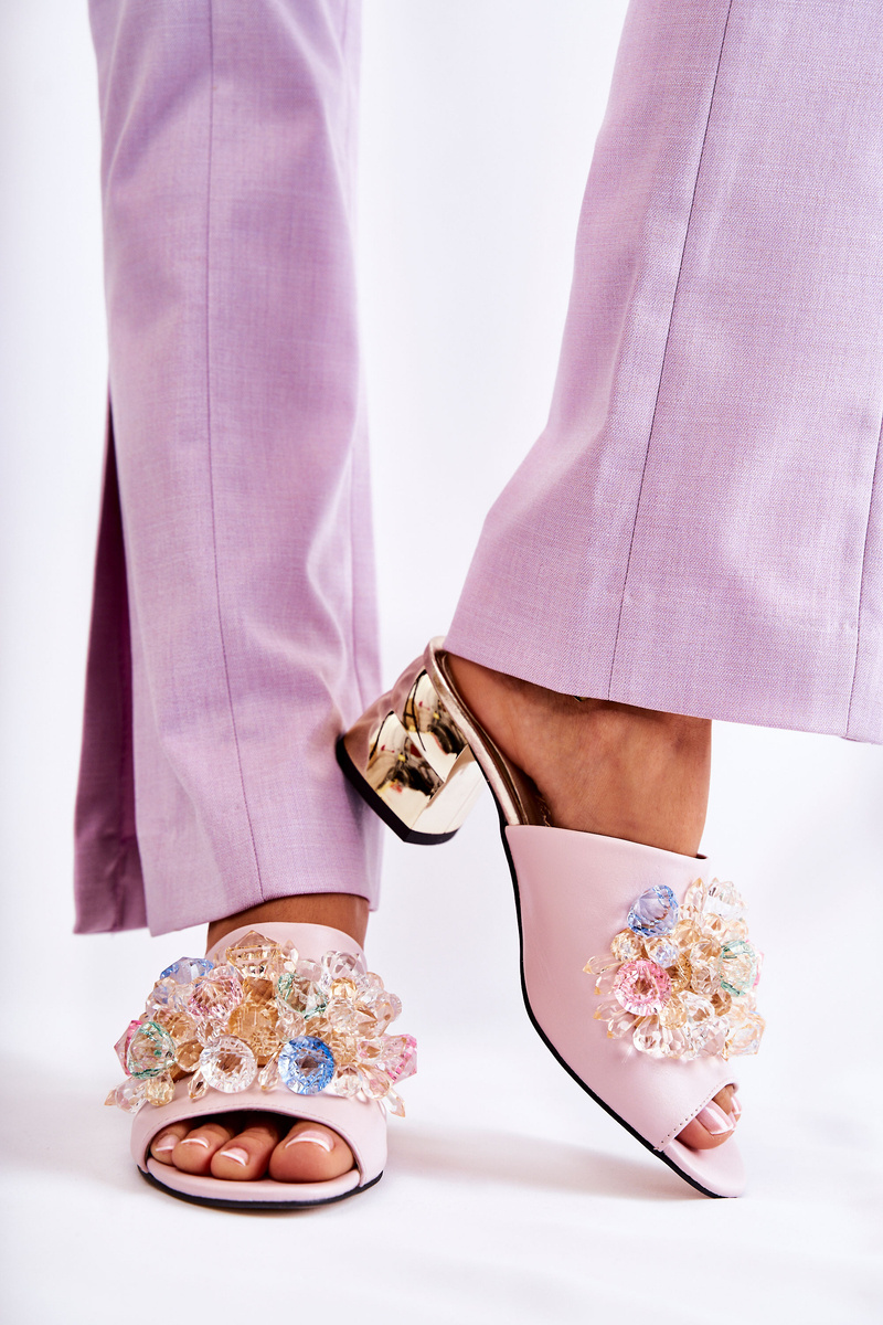 Klapki Skóra Damskie Obcas Ozdoba Różowe Perry