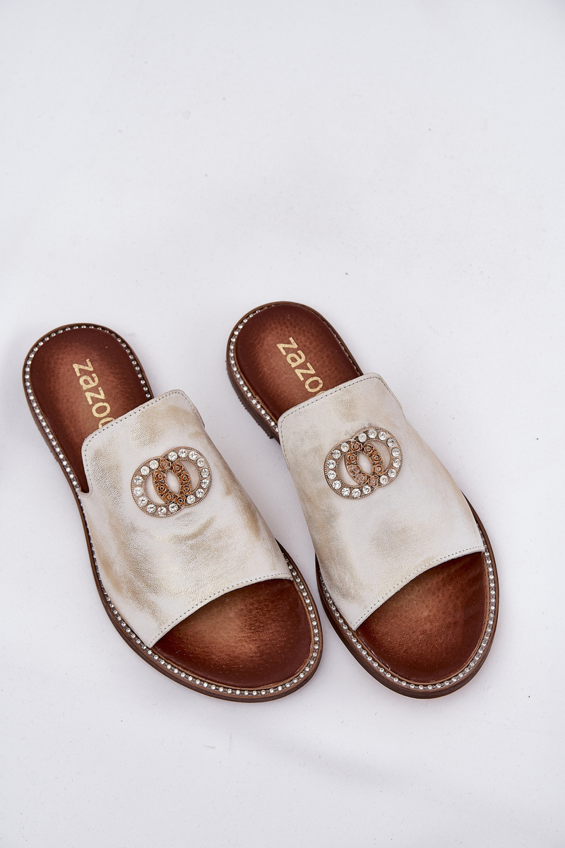 Klapki Skóra Naturalna Płaski Obcas Eleganckie Z Ozdobą Złoty Przecierany Zazoo 3008