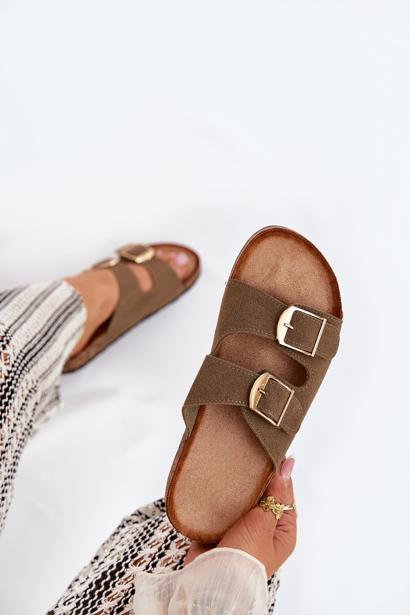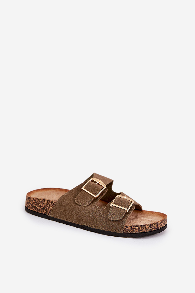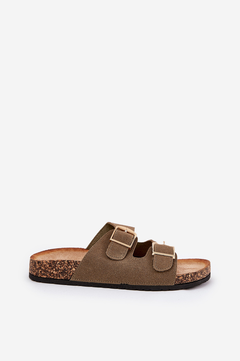 Klasyczne klapki o modnym fasonie pasują do wielu stylizacji! Idealne dla każdej kobiety ceniącej sobie komfort i wygodę na co dzień. Idealne na cieplejsze dni. Modne klapki na korkowej platformie. Model ten wyróżniają dwie złote klamry. Profilowana wkładka z eko zamszu zapewni komfort na każdym kroku. Koniecznie powinnaś je mieć w swojej szafie!