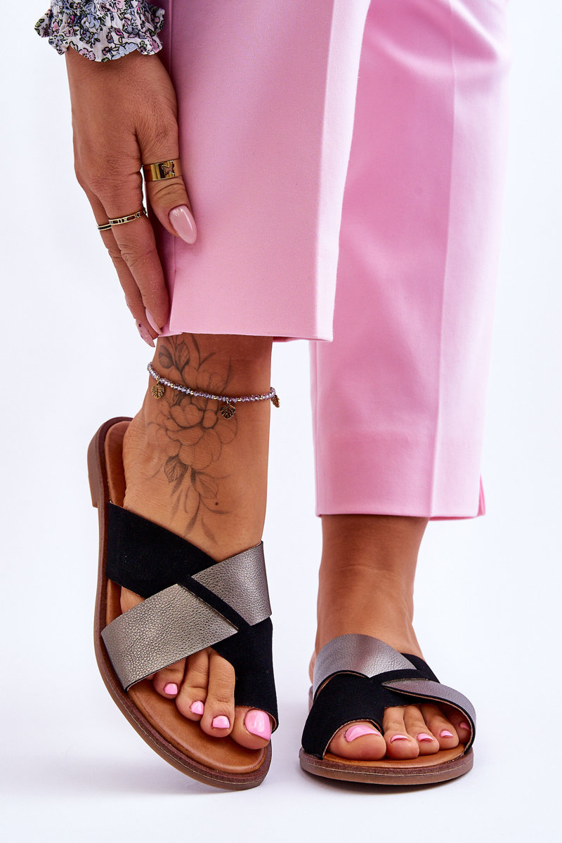 Klasyczne Damskie Skórzane Klapki Czarno-Platynowe Nancy
