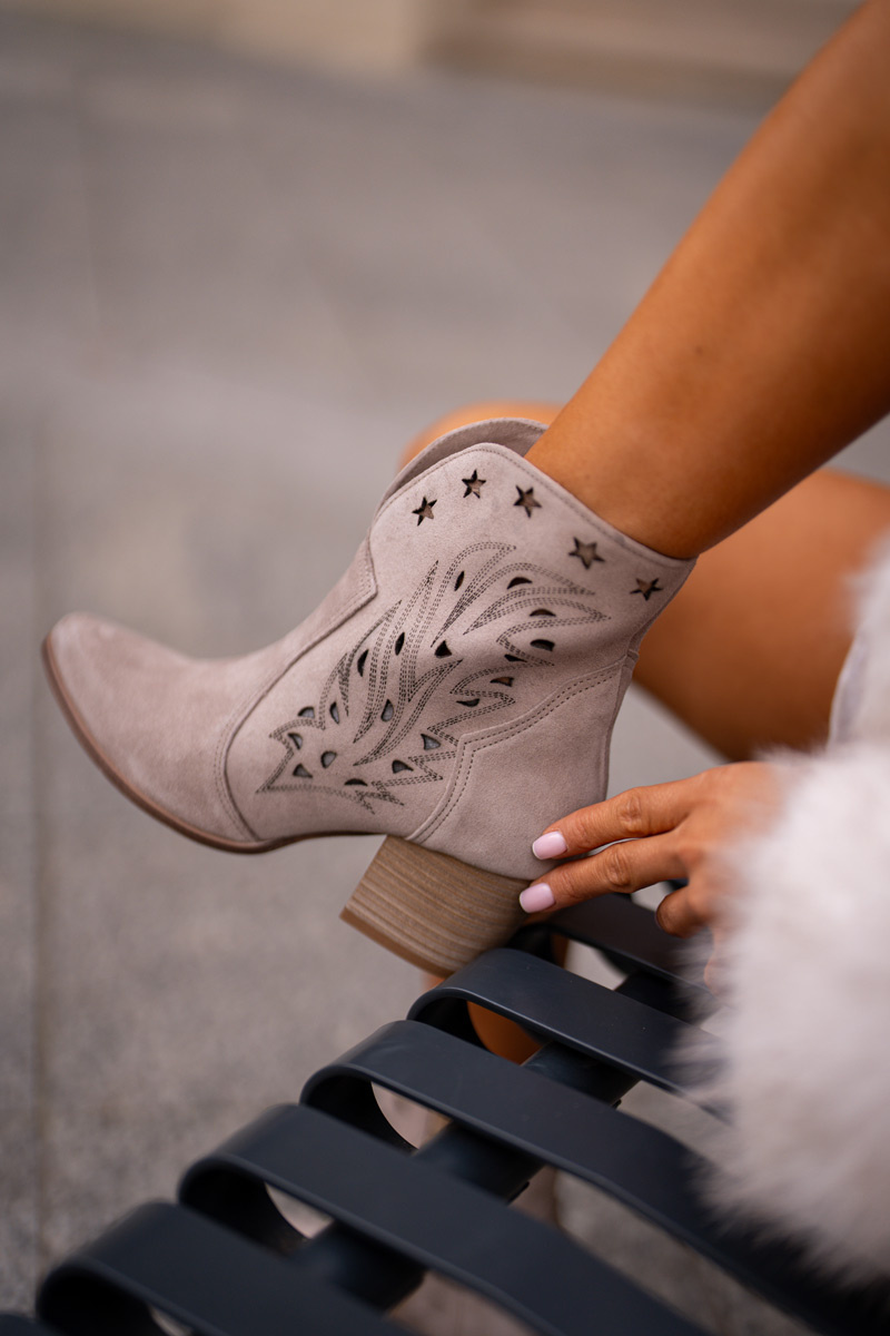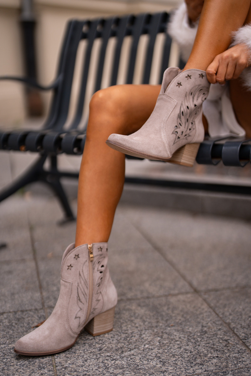 Opinie o Kowbojki Botki Ażurowe Obcas Słupek Zamsz Cappucino Lewski 3613
