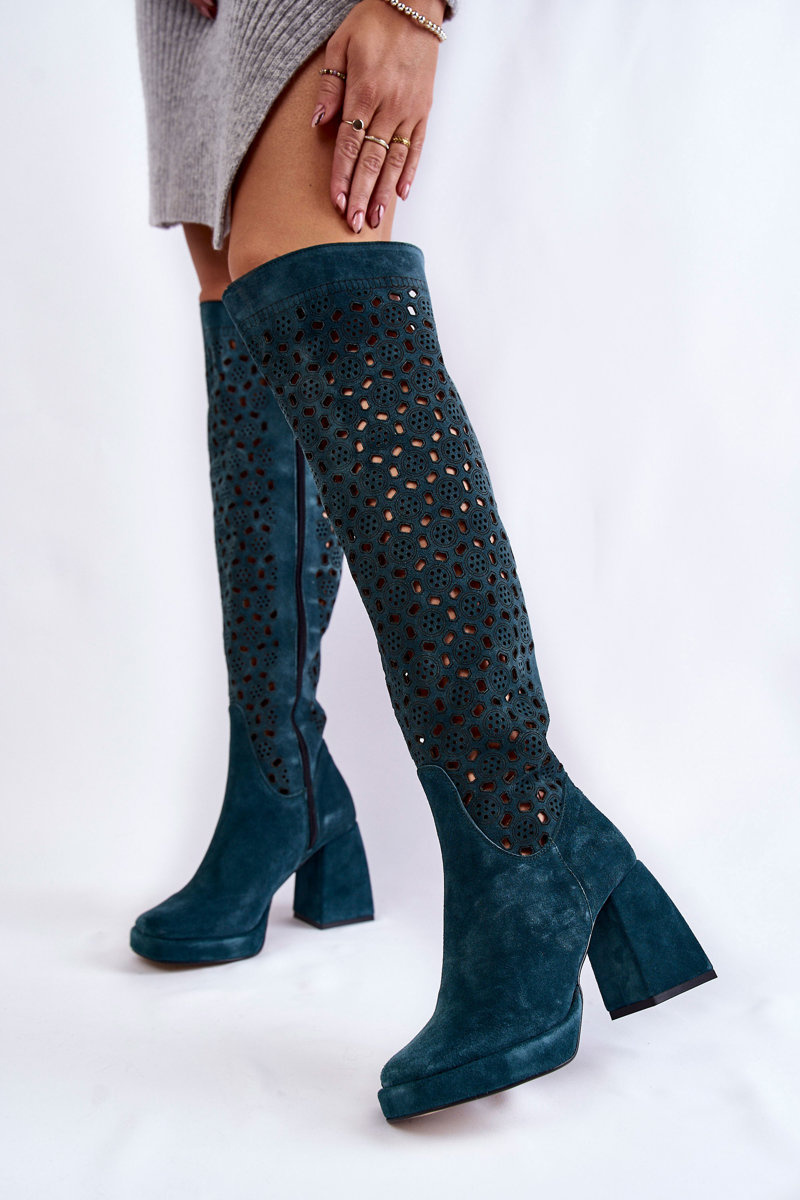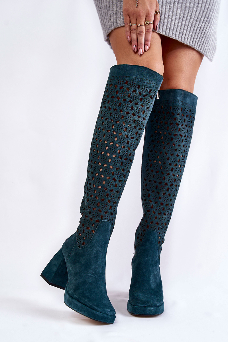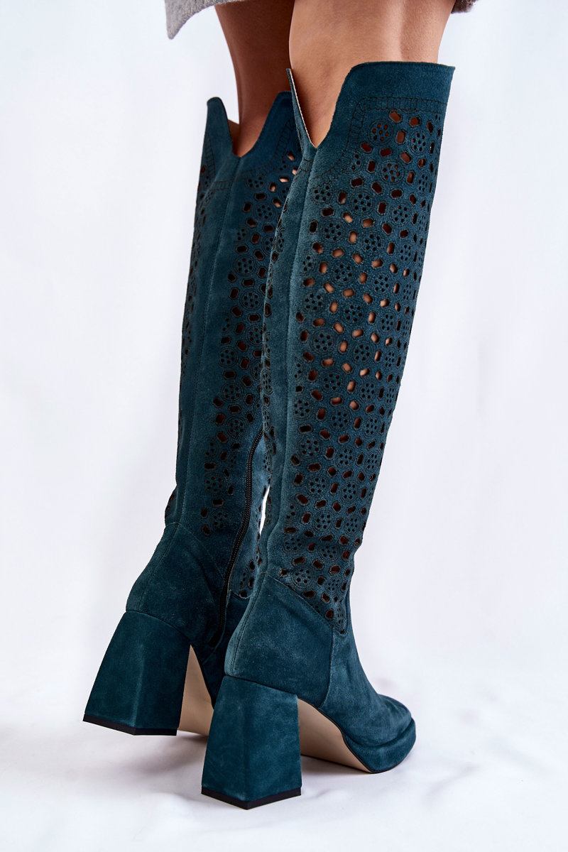 Kozaki Ażur Zamsz Obcas Zielone Castres