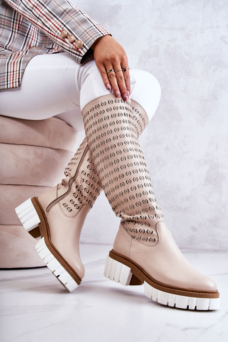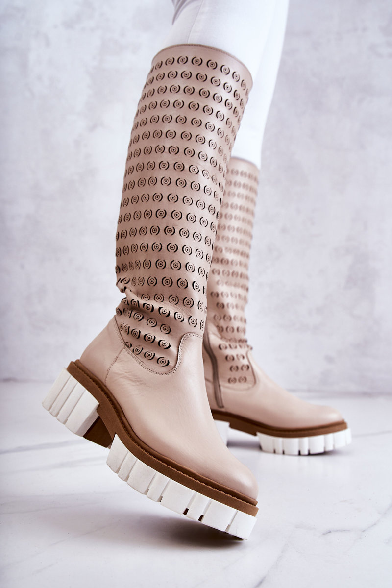 Kozaki Ażurowe Skóra Suwak Beżowe Lativia