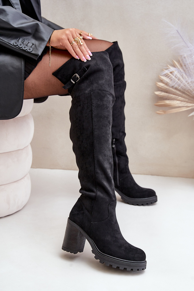 Kozaki na obcasie świetnie sprawdzą się w wielu stylizacjach. Wyjątkowy fason zachwyci każdego! Kozaki są stabilne oraz wygodne w użytkowaniu. Musisz je mieć w swojej szafie ! Wykonane z eko zamszu. Osadzone na obcasie w formie słupka. Noski zaokrąglone. Głównym atutem tego modelu jest cholewka sięgająca za kolano, dodatkowo ozdobiona paseczkiem z klamrą.
