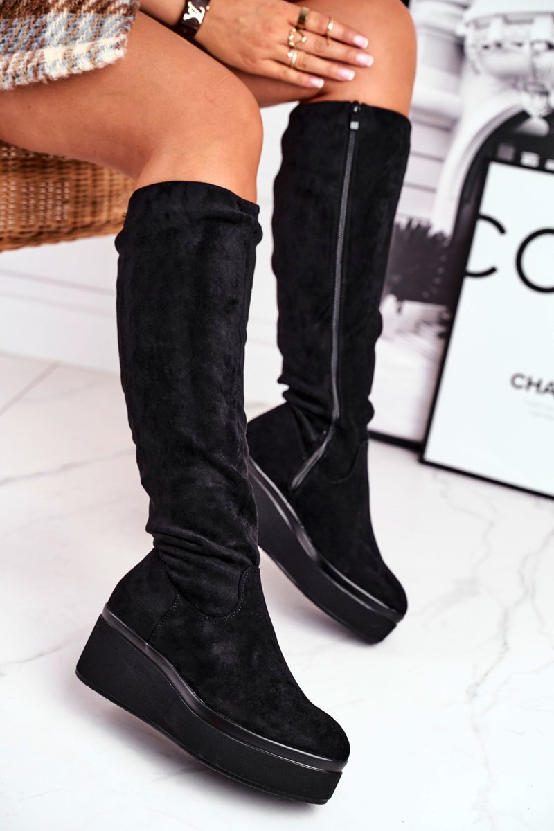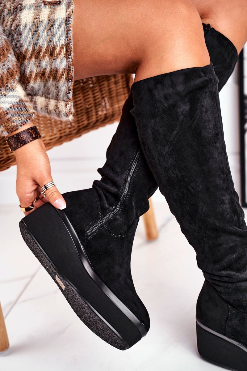 Z takimi butami Twoje zimowe stylizacje z pewnością nie będą nudne! Stylowe kozaki sięgające do kolana, z ciepłym wnętrzem pokrytym kocem obuwniczym. Komfortowe zakładanie dzięki zastosowaniu suwaka na boku. Wysoka 4cm platforma w połączeniu z koturnem to strzał w 10! Te kozaki niesamowicie uniosą Twoją sylwetkę i podkreślą każdy jej walor. Przy wyborze rozmiaru prosimy sugerować się tabelą rozmiarów.
