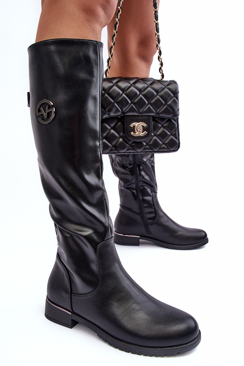 Kozaki Damskie Skóra Płaski Obcas Czarne Albuna 16433