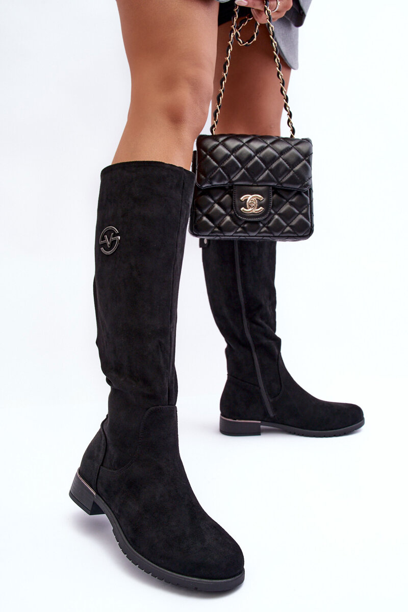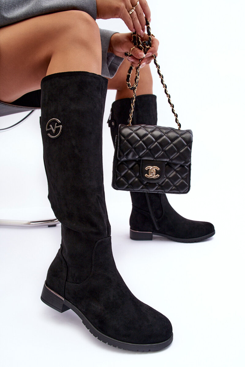 Kozaki Damskie Zamsz Płaski Obcas Czarne Albuna 16433