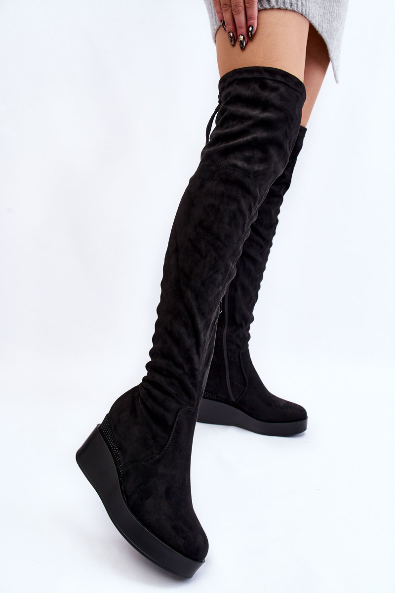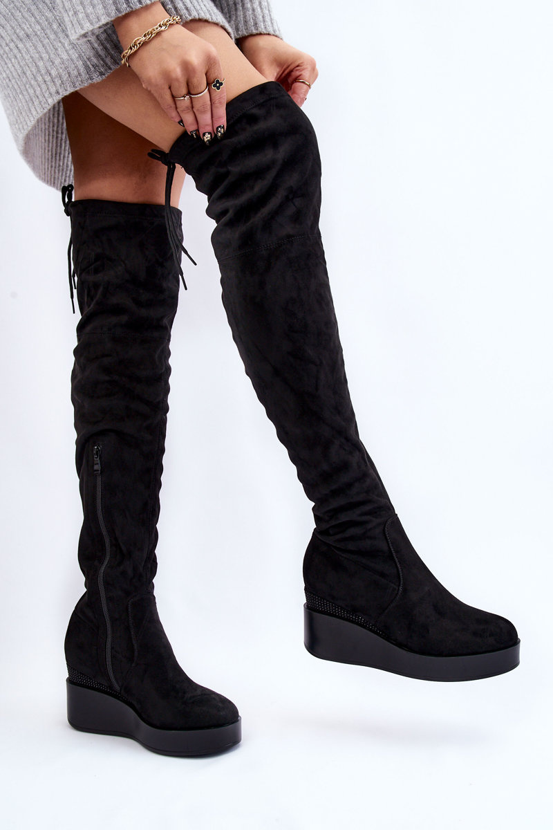 Kozaki na obcasie świetnie sprawdzą się w wielu stylizacjach. Wyjątkowy fason zachwyci każdego! Kozaki są stabilne oraz wygodne w użytkowaniu. Musisz je mieć w swojej szafie! Model został wykonany z tkaniny. Posiadają ocieplenie tylko na wysokości stopy. Zapiętek jest usztywniany. Kozaki osadzono na koturnie i platformie. Model za kolano z wiązaniem u góry cholewki. Dodatkowo przy koturnie znajdują się zdobienia w postaci dżetów. Model wsuwany, z dodatkowym suwakiem.