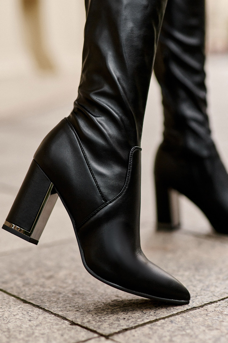 Kozaki na obcasie świetnie sprawdzą się w wielu stylizacjach. Wyjątkowy fason zachwyci każdego! Kozaki są stabilne oraz wygodne w użytkowaniu. Musisz je mieć w swojej szafie ! Wykonane z eko skóry. Model osadzony na obcasie w postaci słupka z lustrzanym elementem. Zapinane na suwak z boku cholewki. Ocieplane na wysokości stopy. Zapiętek usztywniony, noski w szpic.