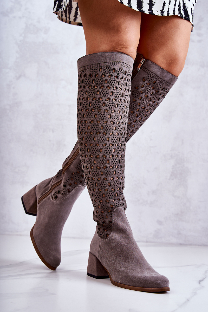 Kozaki Zamsz Ażurowy Wzór Szare Hekilea