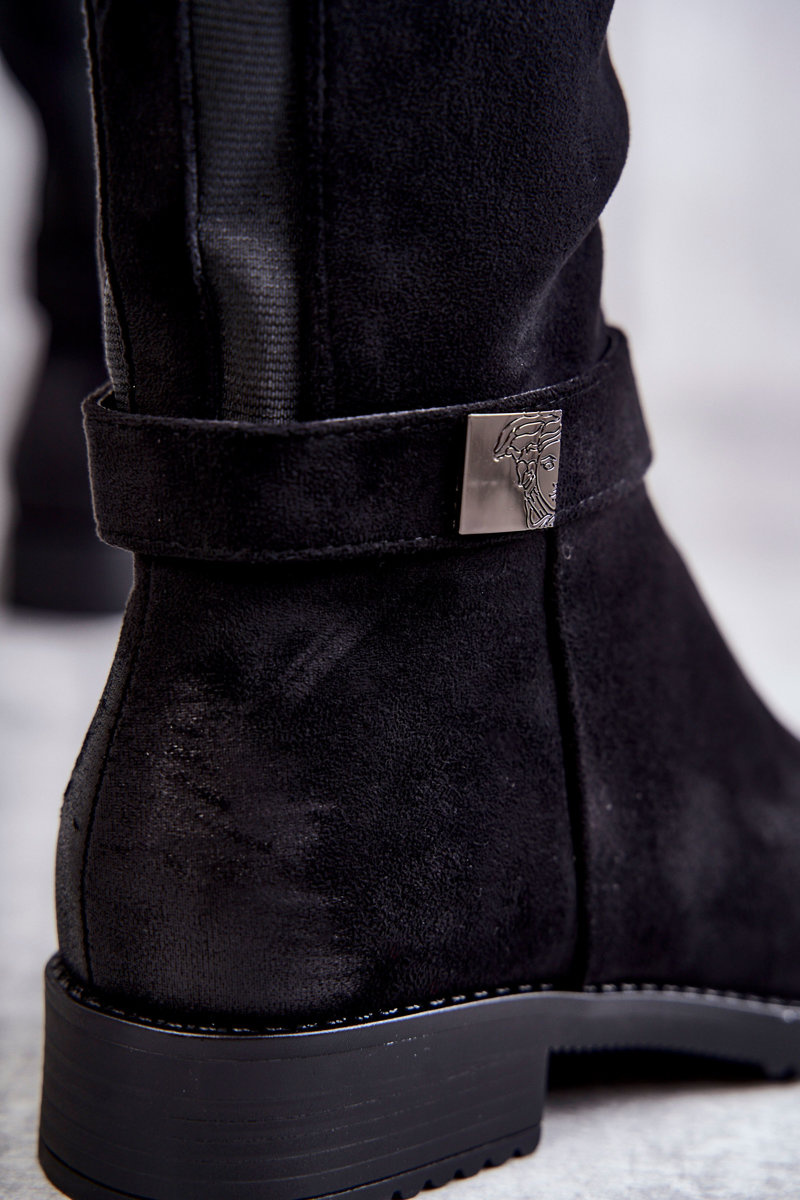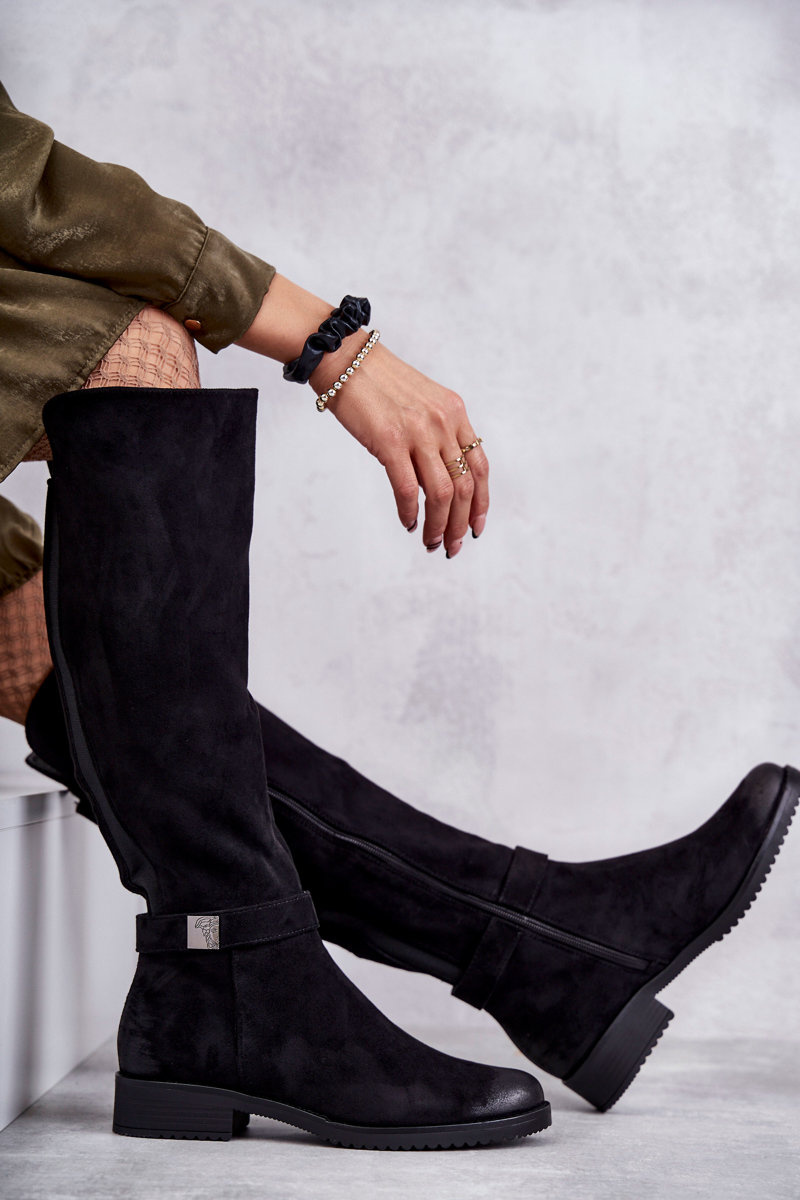 Kozaki Zamsz Damskie Płaski Obcas Czarne Henrike