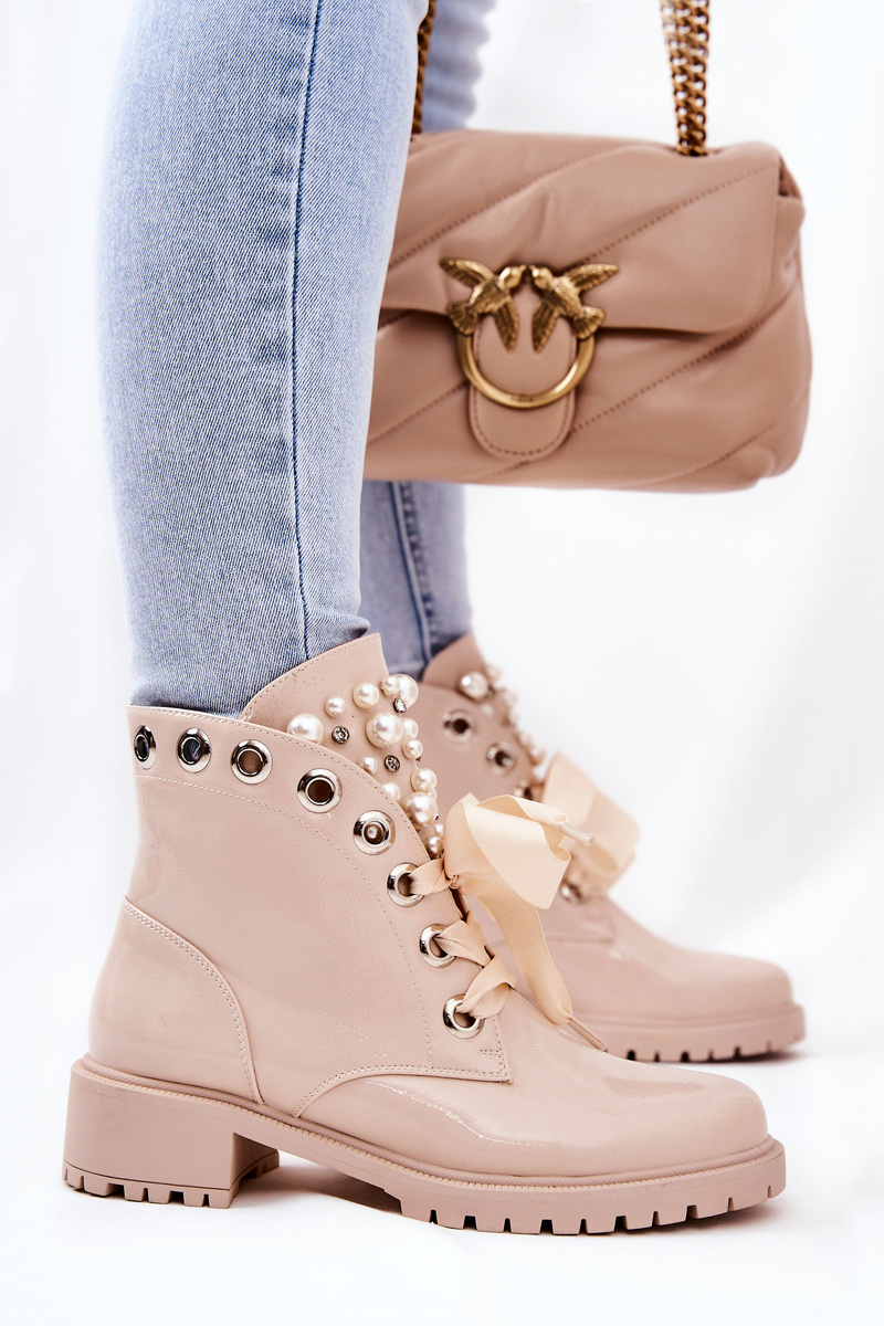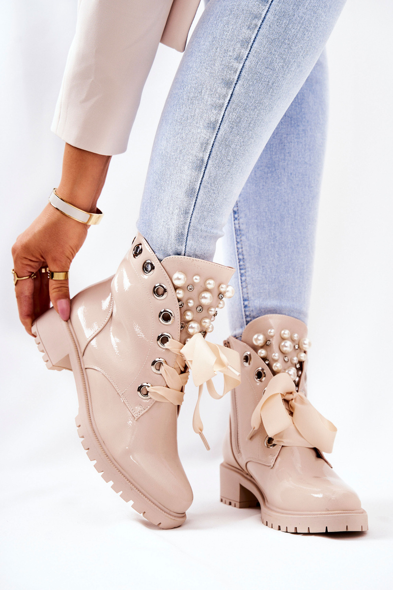 Lakierowane Ocieplane Workery Z Perełkami Beżowe Perla