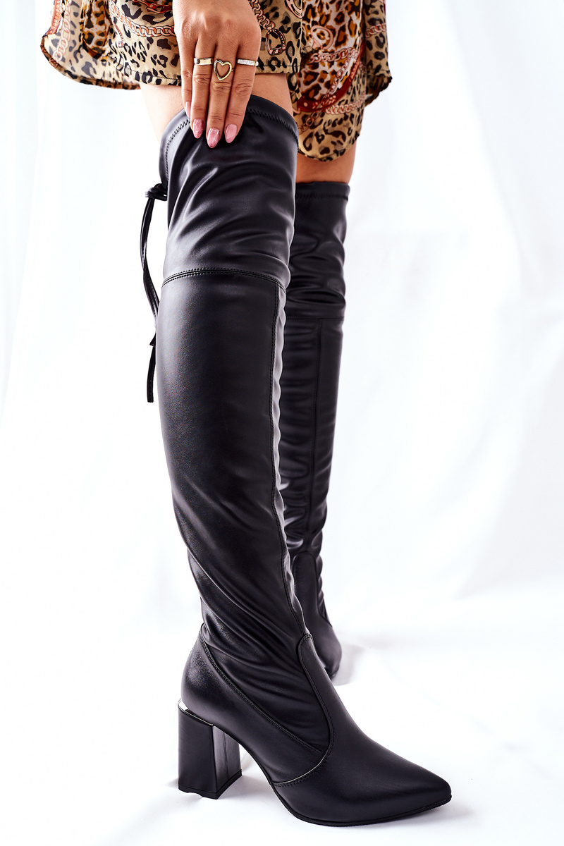 Lewski Skórzane Kozaki na Słupku Czarne Karo