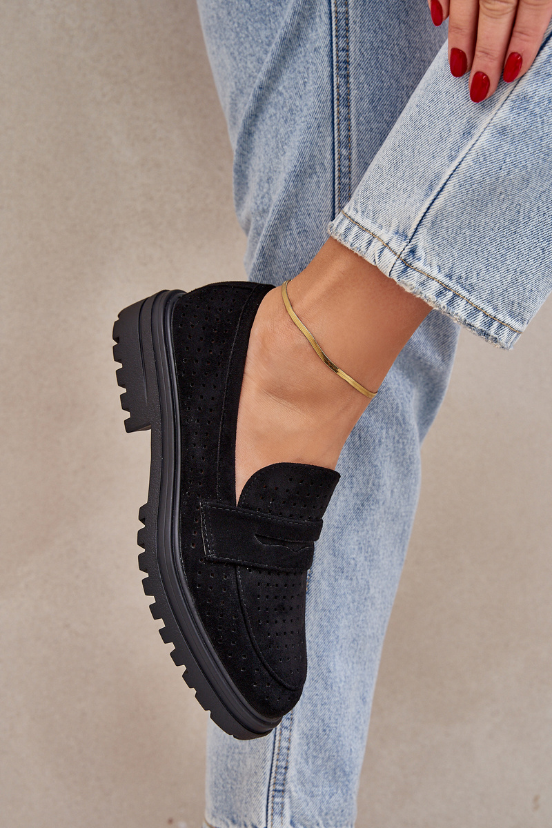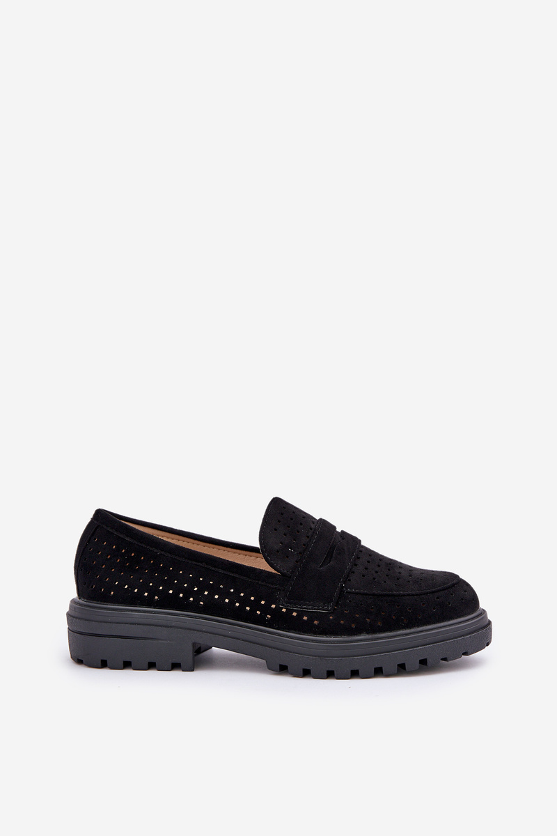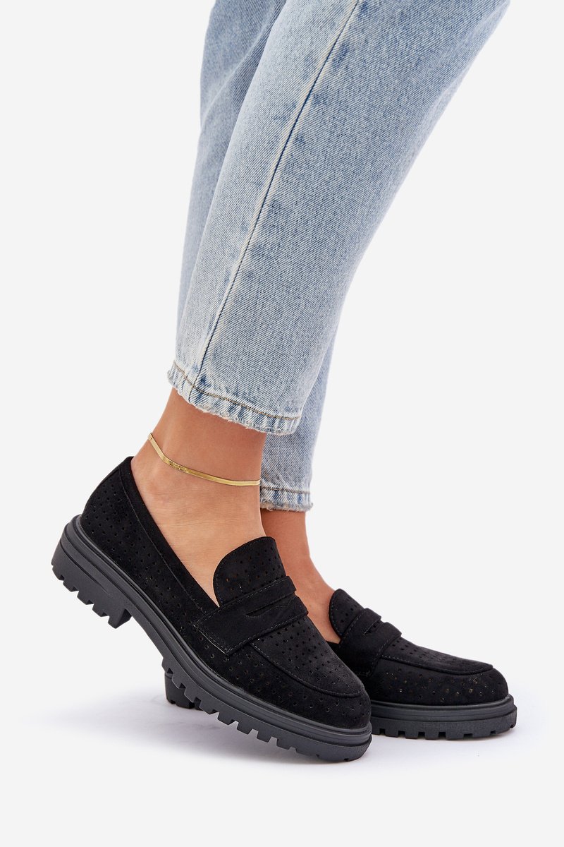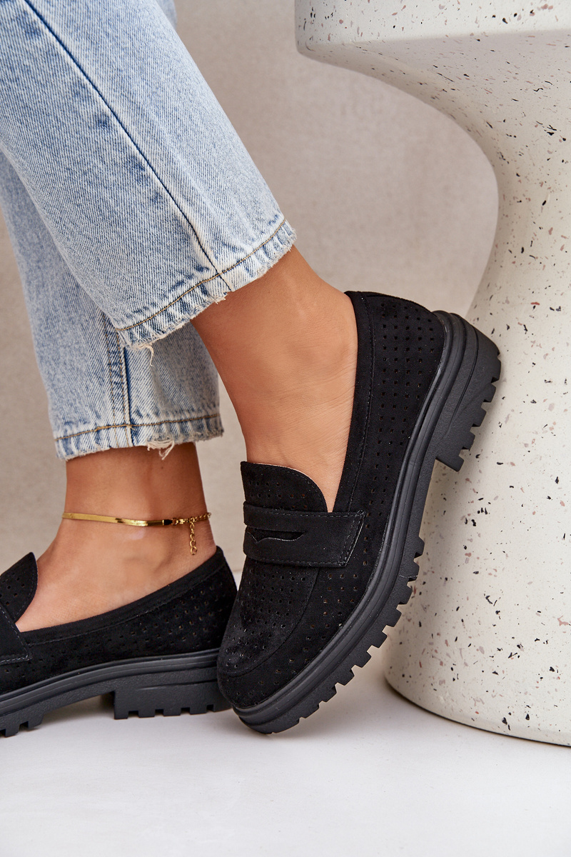 Mokasyny Damskie Ażurowe Eko Zamsz Płaski Obcas Czarne Inestelle