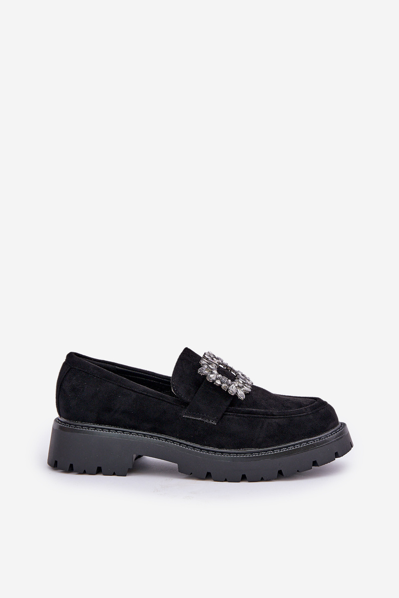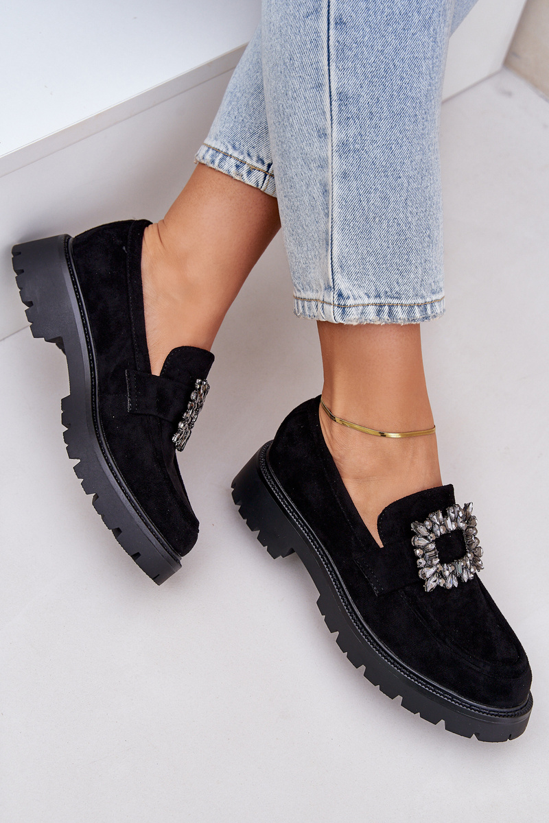 Mokasyny Damskie Ozdobna Broszka Eko Zamsz Czarne Valiana