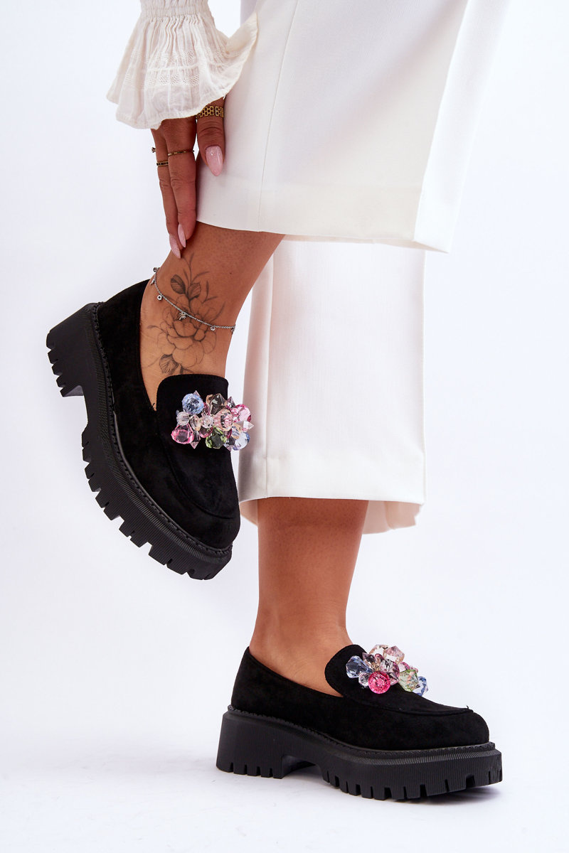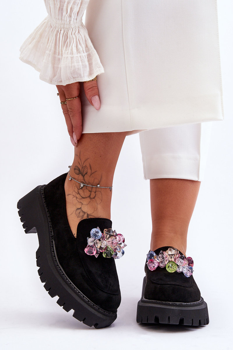 Mokasyny są idealne dla każdej kobiety ceniącej sobie wygodę w użytkowaniu. Ich uniwersalność sprawia, że można łatwo dopasować je do wielu stylizacji. Buty mokasyny są jednym z najczęściej wybieranych modeli w sezonie wiosenno-jesiennym. Wykonane z eko zamszu. Mokasyny posiadają na przodzie ozdoby w postaci kolorowych kryształków. Model ten został osadzony na platformie oraz płaskim obcasie. Wkładka została wykonana z naturalnej skóry.