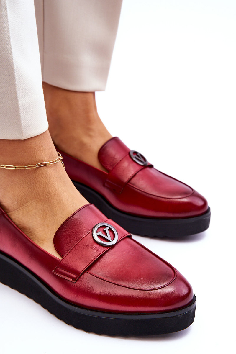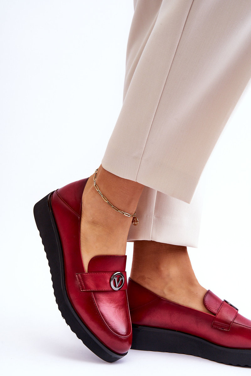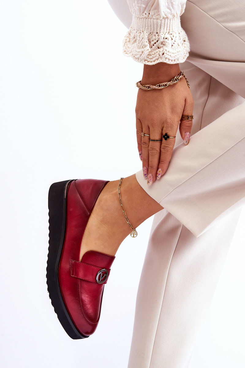 Mokasyny są idealne dla każdej kobiety ceniącej sobie wygodę w użytkowaniu. Ich uniwersalność sprawia, że można łatwo dopasować je do wielu stylizacji. Buty mokasyny są jednym z najczęściej wybieranych modeli w sezonie wiosenno-jesiennym. Modne mokasyny damskie zostały wykonane z wysokiej jakości eko skóry. Posiadają pasek z ozdobą w kształcie koła i literą V. Buty te zostały osadzone na niskim koturnie z delikatną platformą. Mokasyny posiadają wkładkę wykonaną z naturalnej skóry.