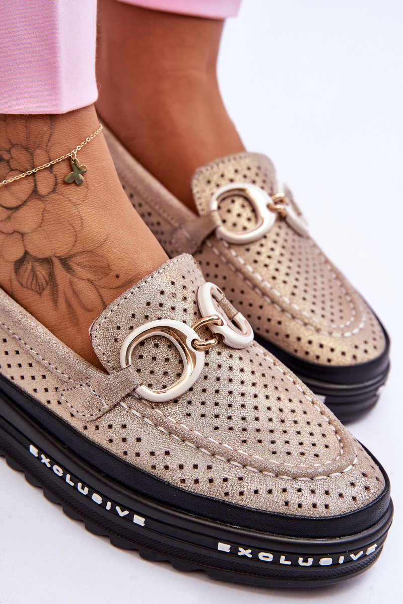 Mokasyny Klasyczne Skóra Ażurowe Ozdoba Złote Rendy
