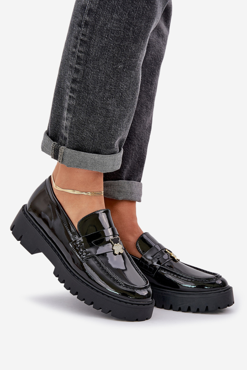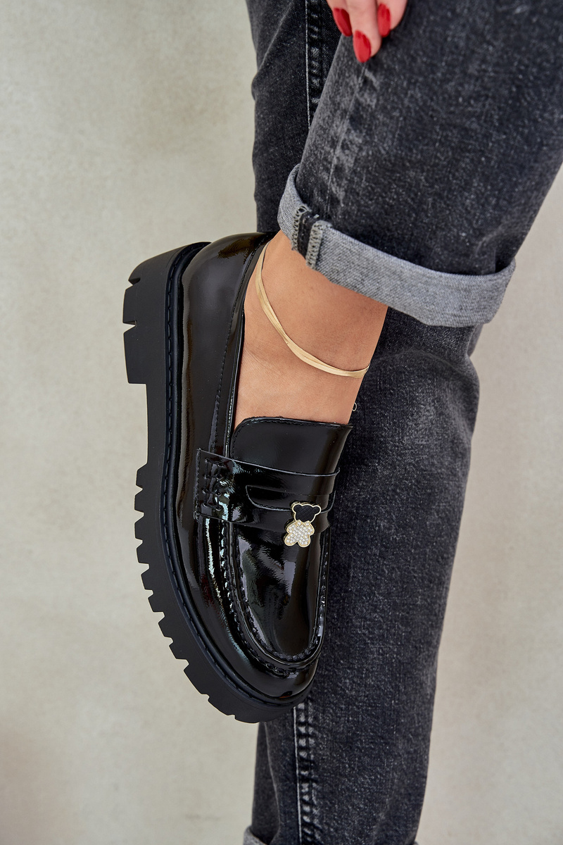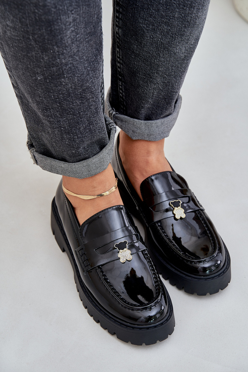 Mokasyny Lakierowane Damskie Przypinka Miś Czarne Wulinea
