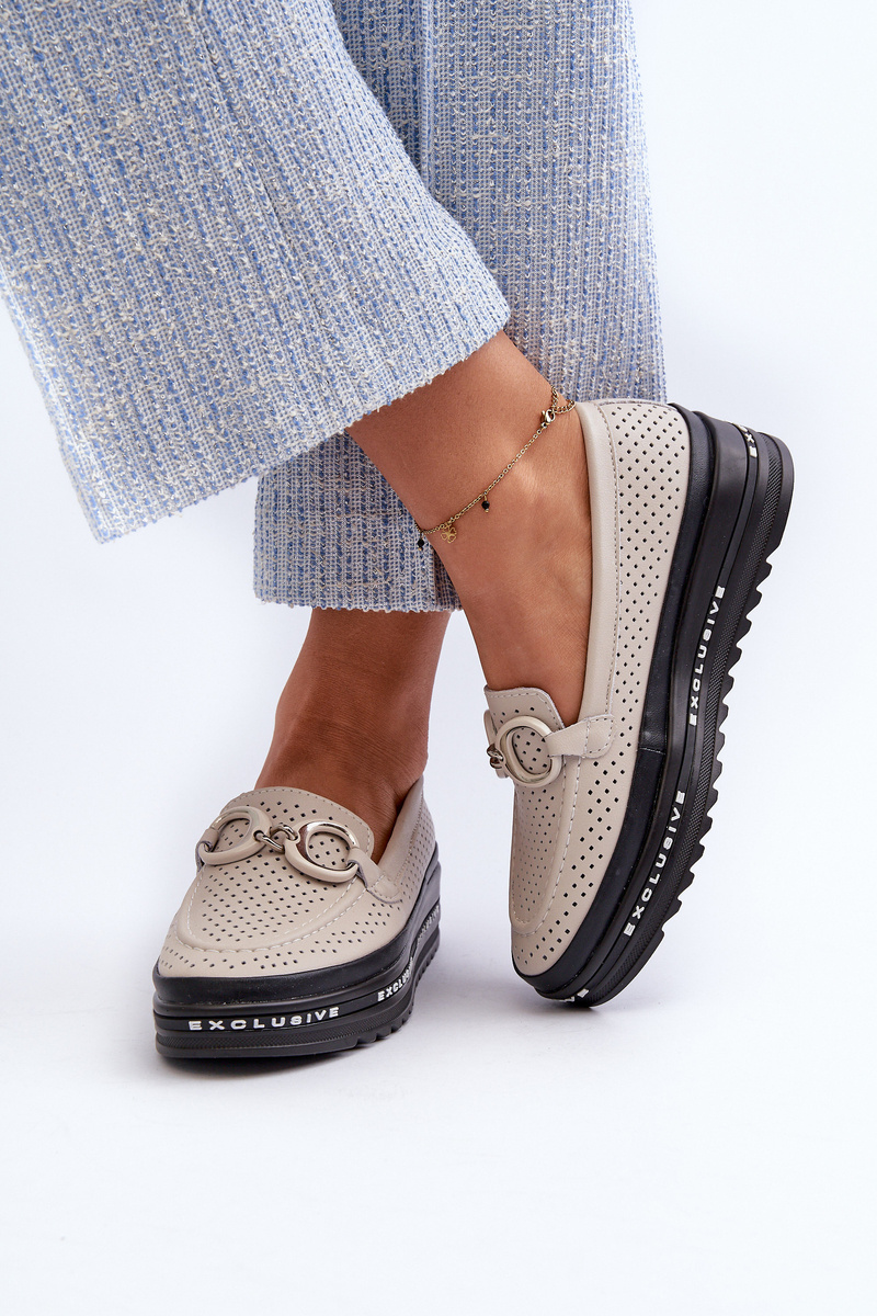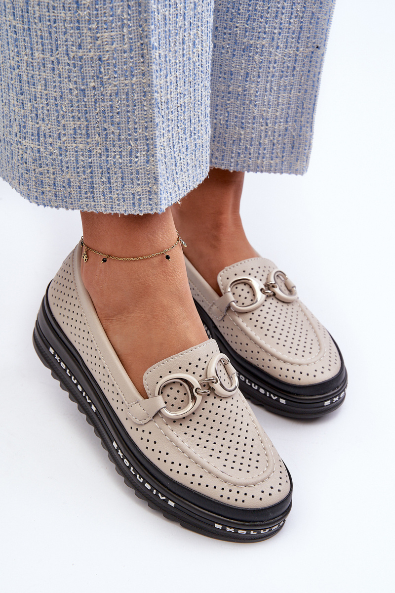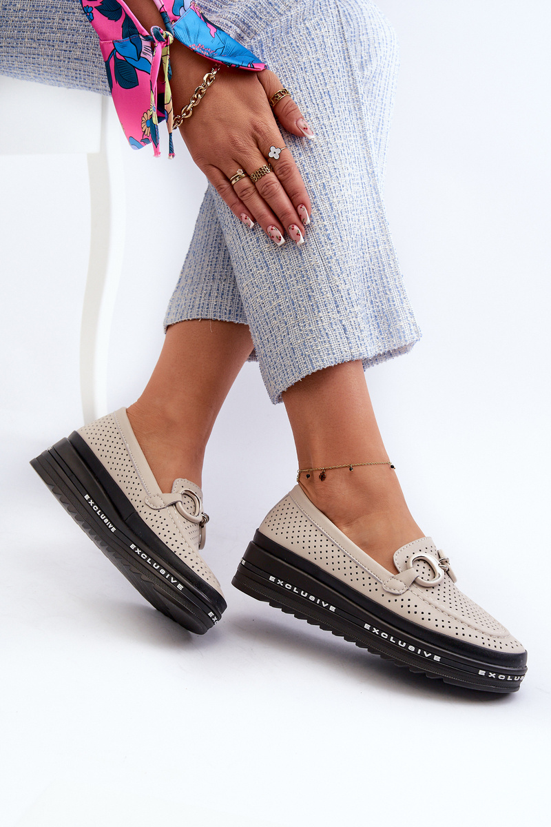 Mokasyny Skórzane Na Platformie Z Ozdobą Beżowe S.Barski LR750