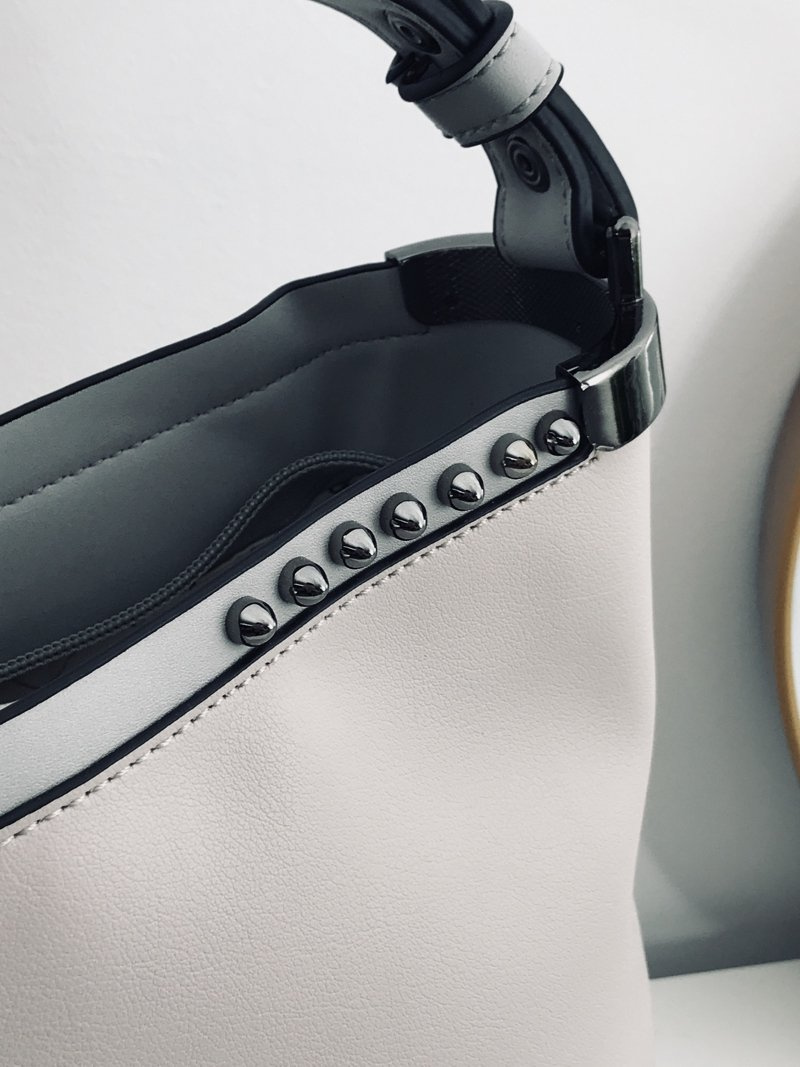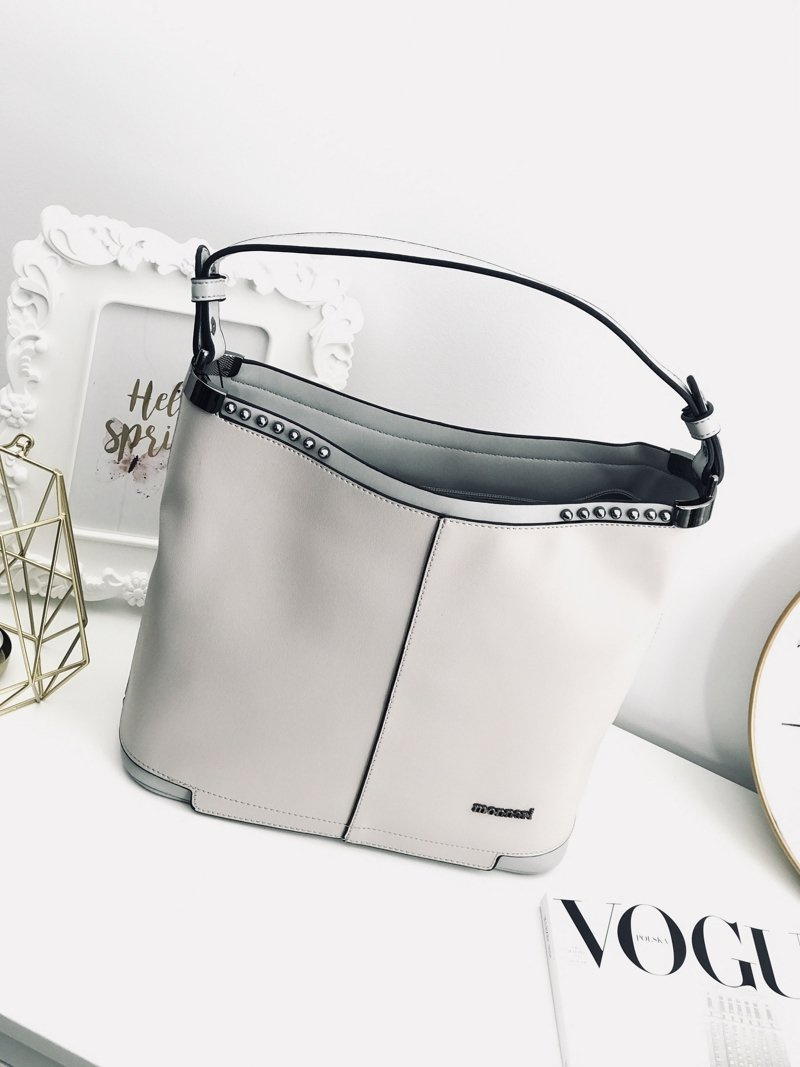 Wykonana z ekoskóry torba damska typu shopperka, średniej wielkości, mieszcząca A4. Torebka zdobiona połyskującymi ćwiekami i metalowymi okuciami. Wnętrze torby z jasną podszewką, otwartymi przegródkami i kieszenią na dokumenty. Z tyłu torby kieszonka na telefon. Polecamy ten model jako dodatek do miejskiej stylizacji.