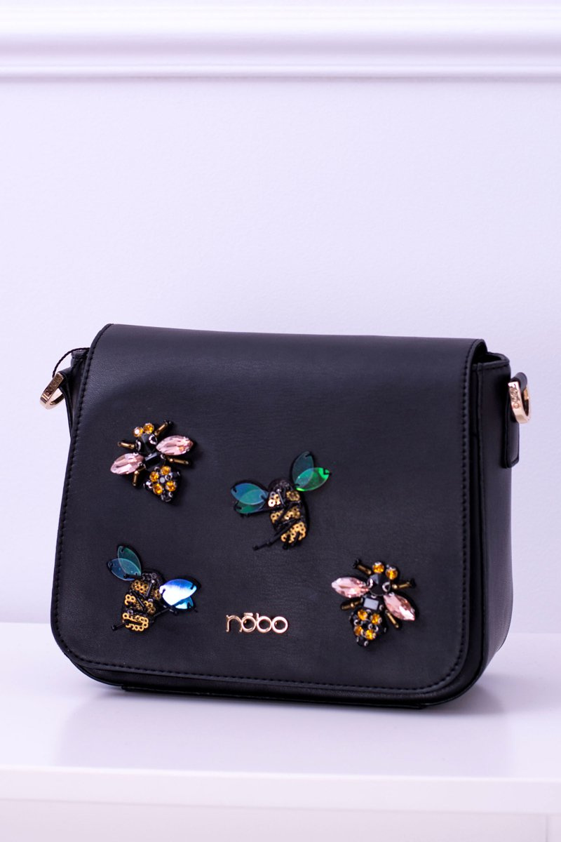 Wykonana z ekoskóry torebka damska typu listonoszka, średniej wielkości, nie mieszcząca A4. Torebka w pięknym klasycznym czarnym kolorze. Wnętrze torby z jasną podszewką z logiem NOBO, oraz z dwoma kieszonkami w tym jedną zapinaną na zamek. Przednia klapa zdobiona kilkoma słodkimi pszczółkami. Polecamy ten model jako dodatek do miejskich stylizacji.