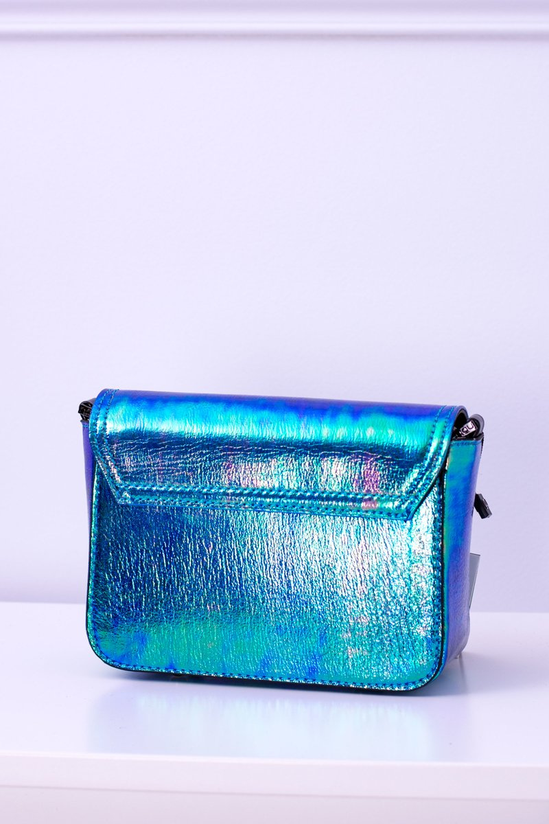 Wykonana z ekoskóry torebka damska typu listonoszka, średniej wielkości, nie mieszcząca A4. Torebka w pięknym benzynowym odcieniu. Wnętrze torby z jasną podszewką, z dwoma kieszonkami w tym jedną zapinana na zamek. Polecamy ten model jako dodatek do wieczorowych stylizacji.