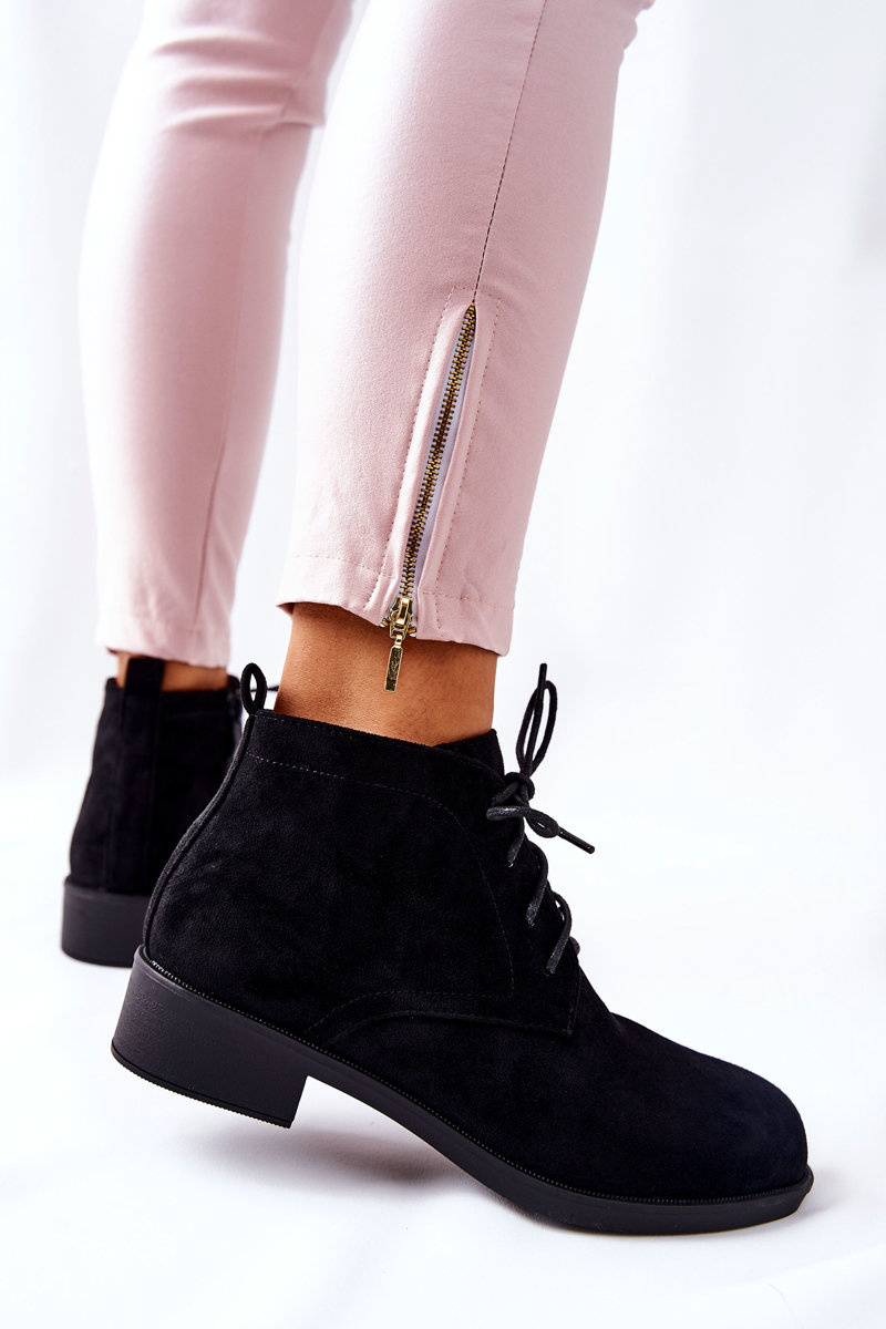 Piękne botki wykonane z eko zamszu. Posiadają wiązanie w kolorze obuwia oraz suwak ułatwiający zakładanie obuwia. Całość w środku jest ocieplona kocem obuwniczym. Płaski, niski obcas zapewni stabilność oraz komfort podczas długich spacerów. Sprawdź koniecznie naszą ofertę botków! Przy wyborze rozmiaru prosimy sugerować się tabelą rozmiarów.