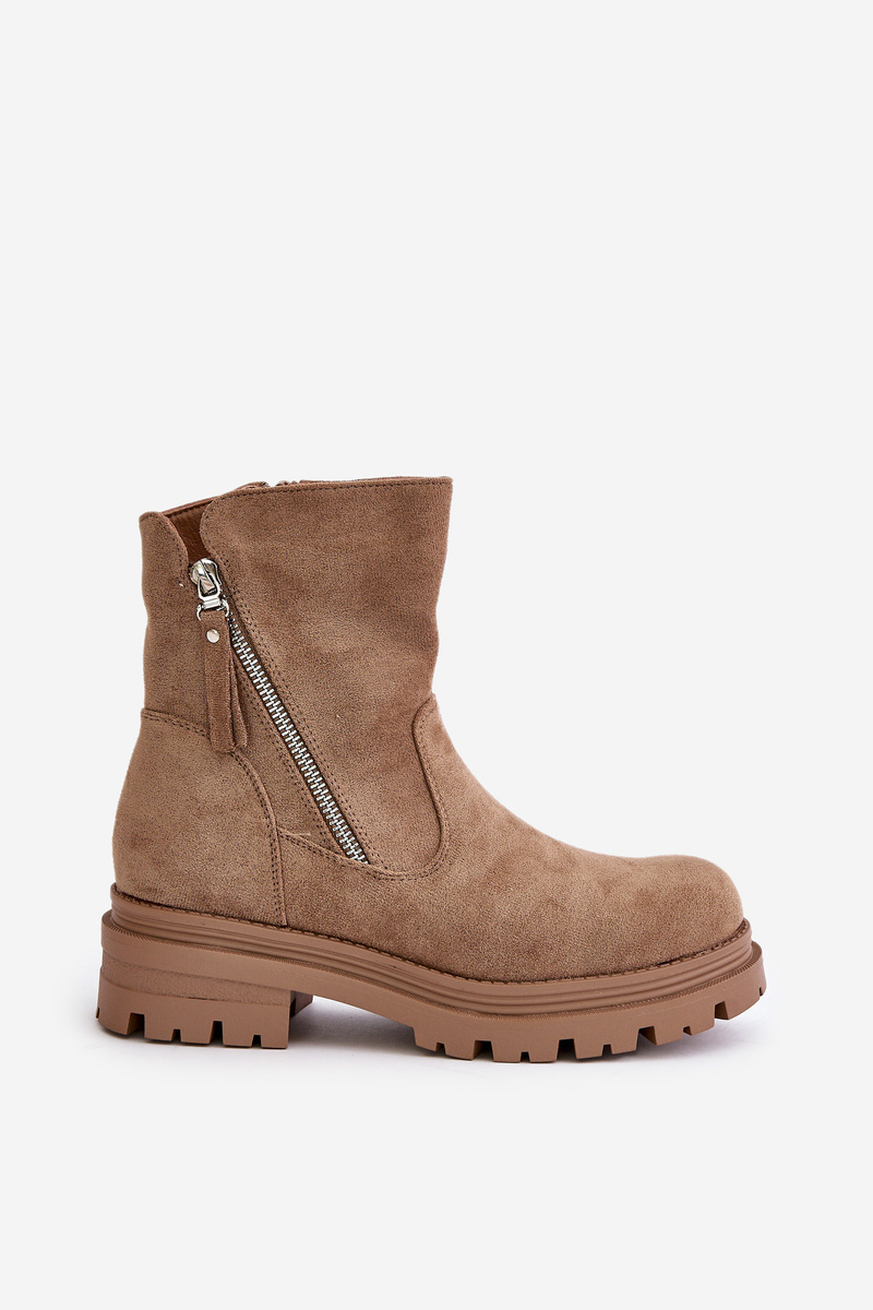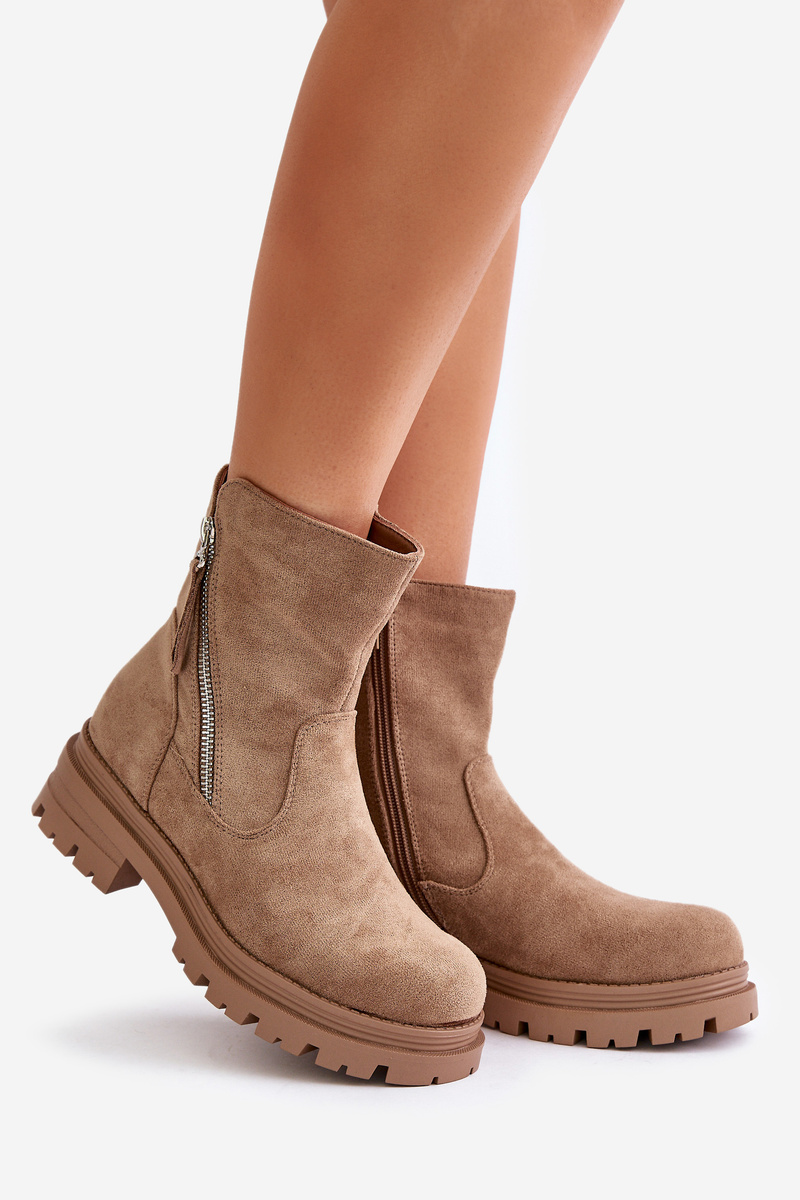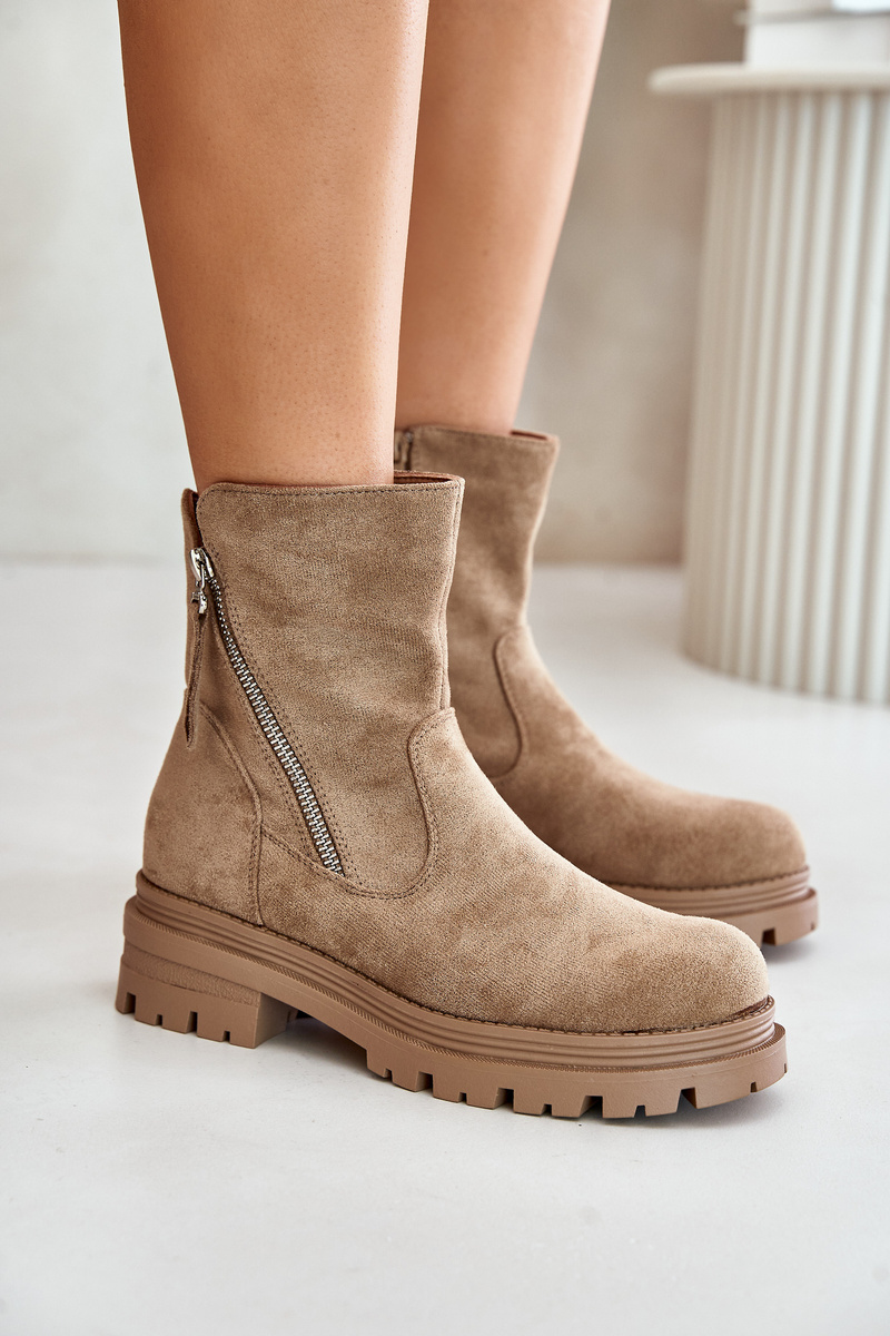 Ocieplane Botki Płaski Obcas Zamki Eko Zamsz Beżowe Reloma
