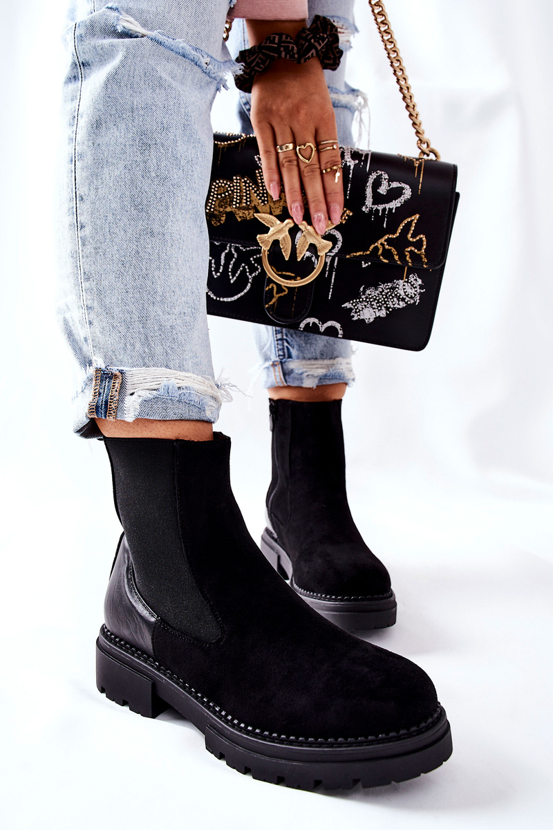 Botki damskie wykonane z eko zamszu. Wnętrze ocieplone jest miłym w dotyku kocem obuwniczym. Posiadają suwak oraz elastyczną cholewkę. Stabilny płaski obcas zapewni komfort w różnych warunkach atmosferycznych. Przy wyborze rozmiaru prosimy sugerować się tabelą rozmiarów.