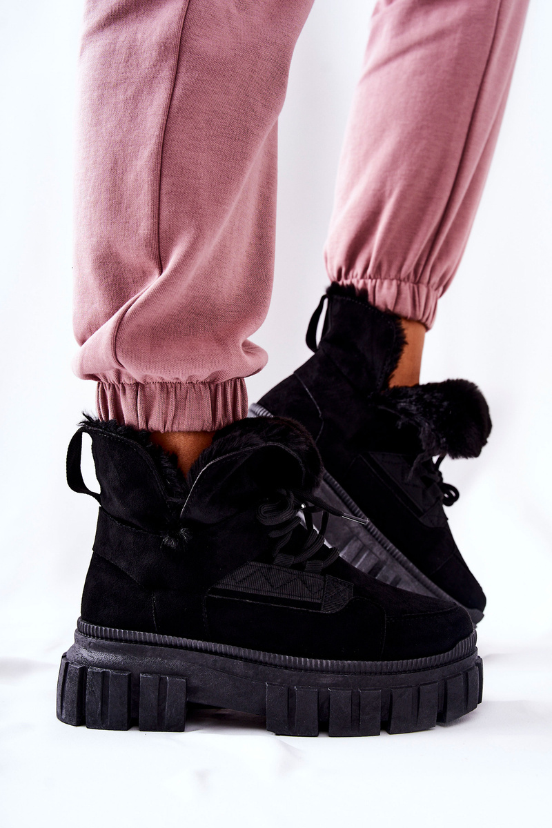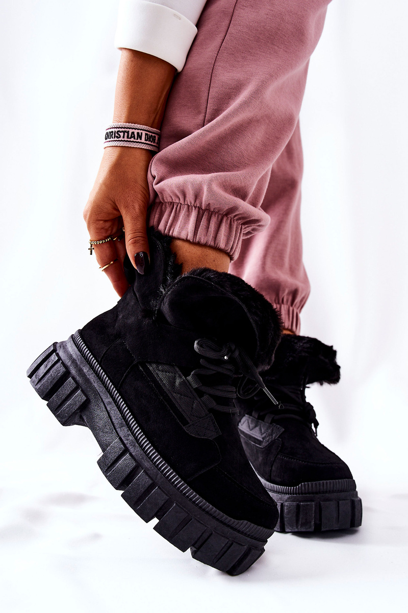 Botki zostały wykonane z zamszowej skóry ekologicznej. Wewnątrz znajduje się ciepłe i miłe w dotyku futerko. Masywna, gruba podeszwa zapewnia stabilność. Buty posiadają wiązanie, dzięki któremu można je dopasować do tęgości nogi. Idealnie sprawdzą się w zimowe dni! Przy wyborze rozmiaru prosimy sugerować się tabelą rozmiarów.
