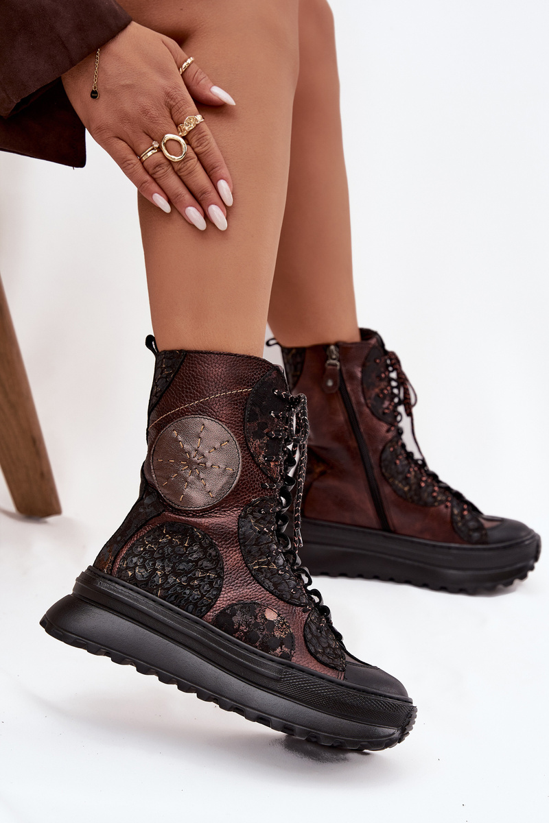 Ocieplane Skórzane Botki Na Platformie Brązowo-Złote Maciejka 06565-04