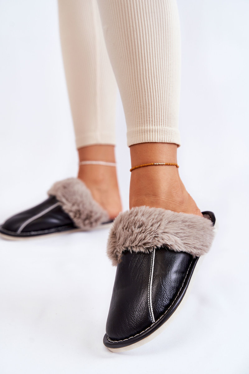 Papcie Damskie Skóra Futerko Czarne Rossa