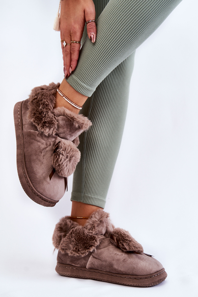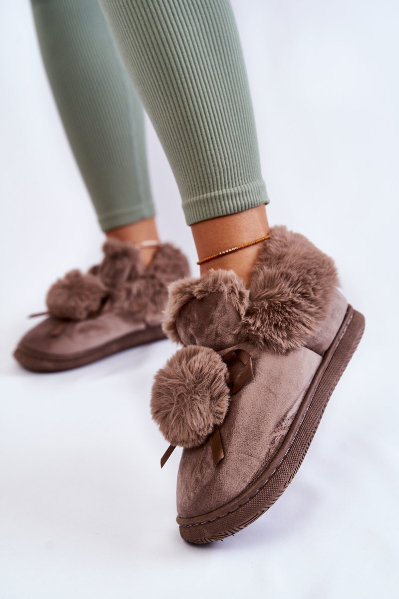 Papcie Damskie Wsuwane Futrzane Pompon Brązowe Noemi