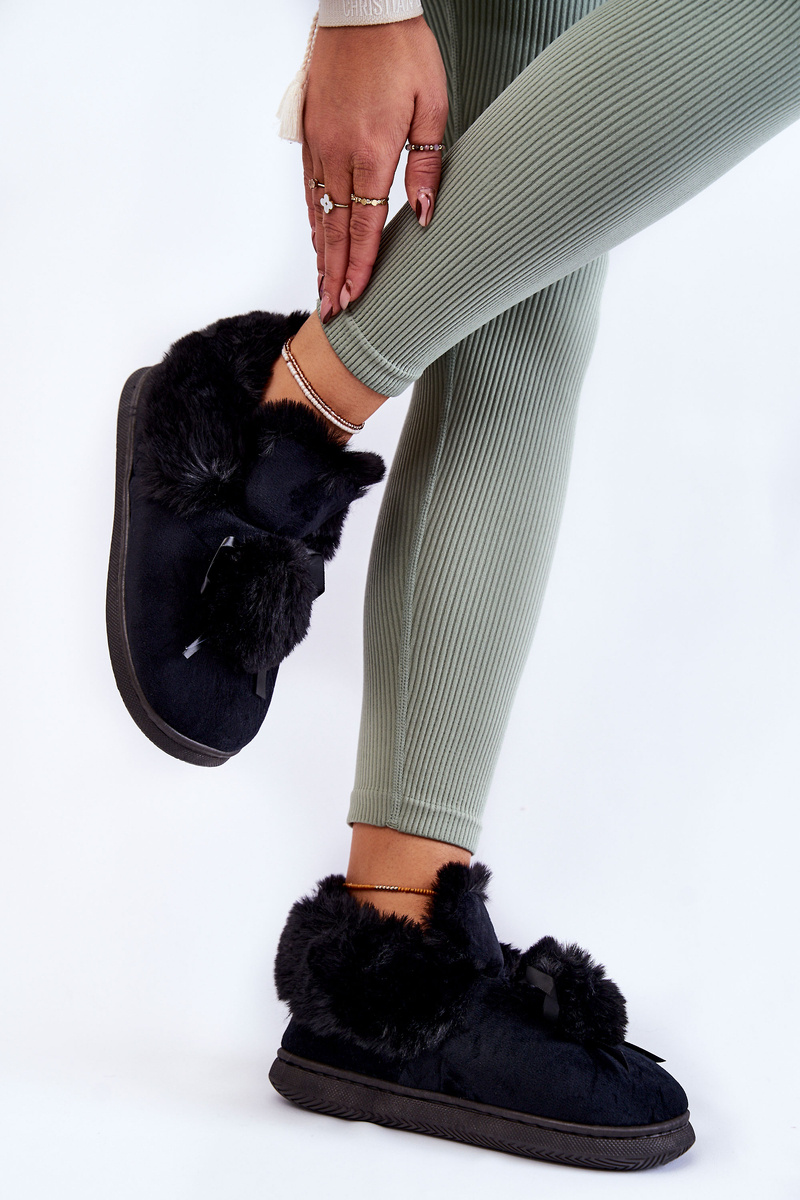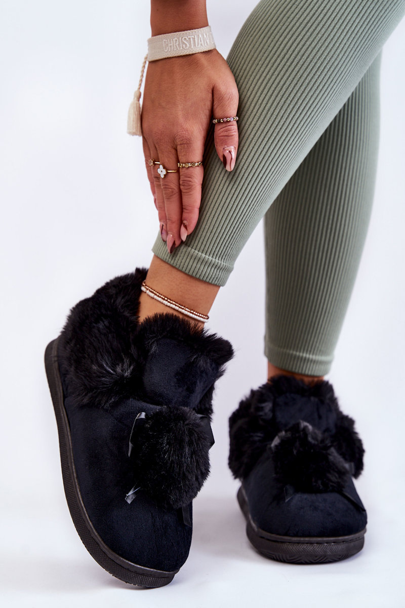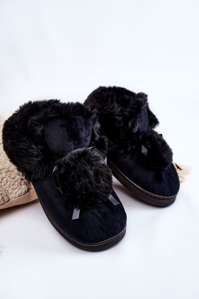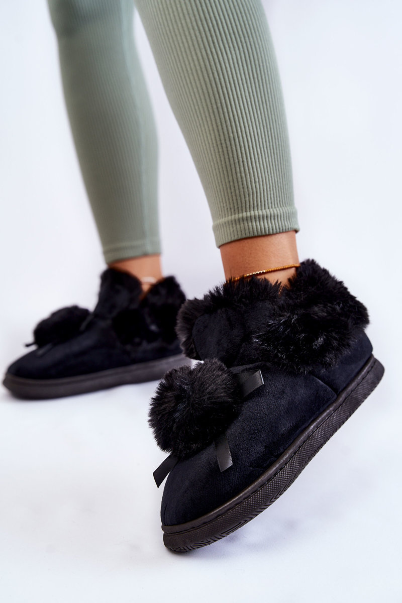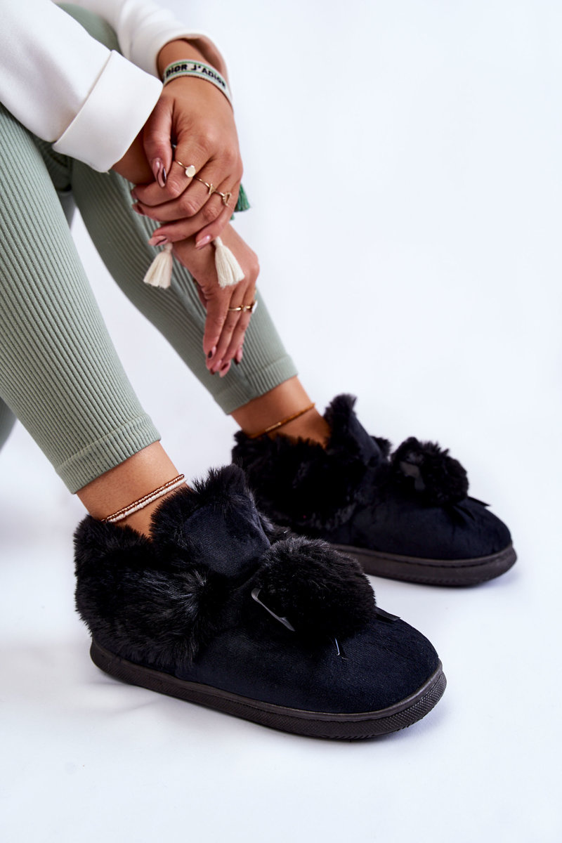 Papcie Damskie Wsuwane Futrzane Pompon Czarne Noemi