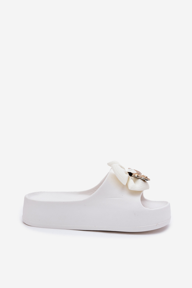 Piankowe Klapki Platforma Kokardka Złota Broszka Białe Marlize