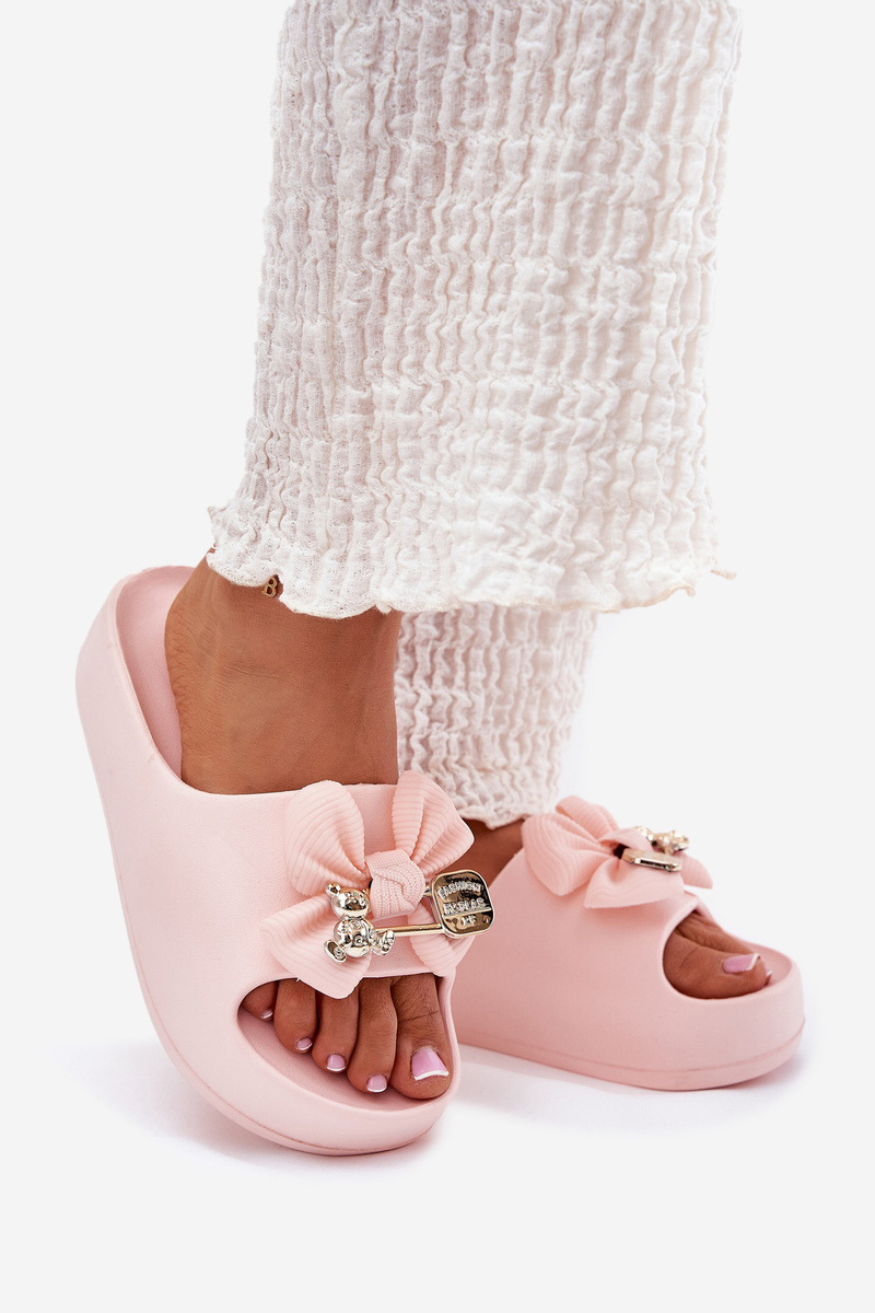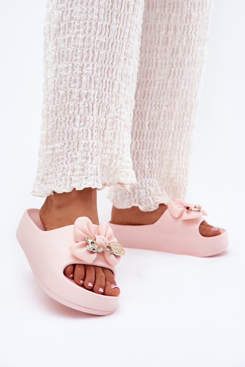Piankowe Klapki Platforma Kokardka Złota Broszka Różowe Marlize