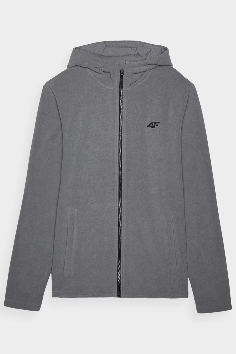 Bluza polarowa dla mężczyzny jest wykonana z gładkiego i miękkiego w dotyku polaru, który cechuje się bardzo dobrą izolacją termiczną, a przy tym oddycha i szybko schnie. Technologia 4FWarm wspiera komfort cieplny. Bluza polarowa dla mężczyzny posiada stójkę z nieodpinanym kapturem bez regulacji. Mankiety z materiału zasadniczego. Po bokach znajdują się 2 kieszenie otwarte. Zapinany na jednokierunkowy zamek główny. Posiada krój regular, który wygodnie dopasowuje się do sylwetki oraz standardową długość sięgającą do linii bioder. Poliester 100% Materiał główny: Poliester 100%