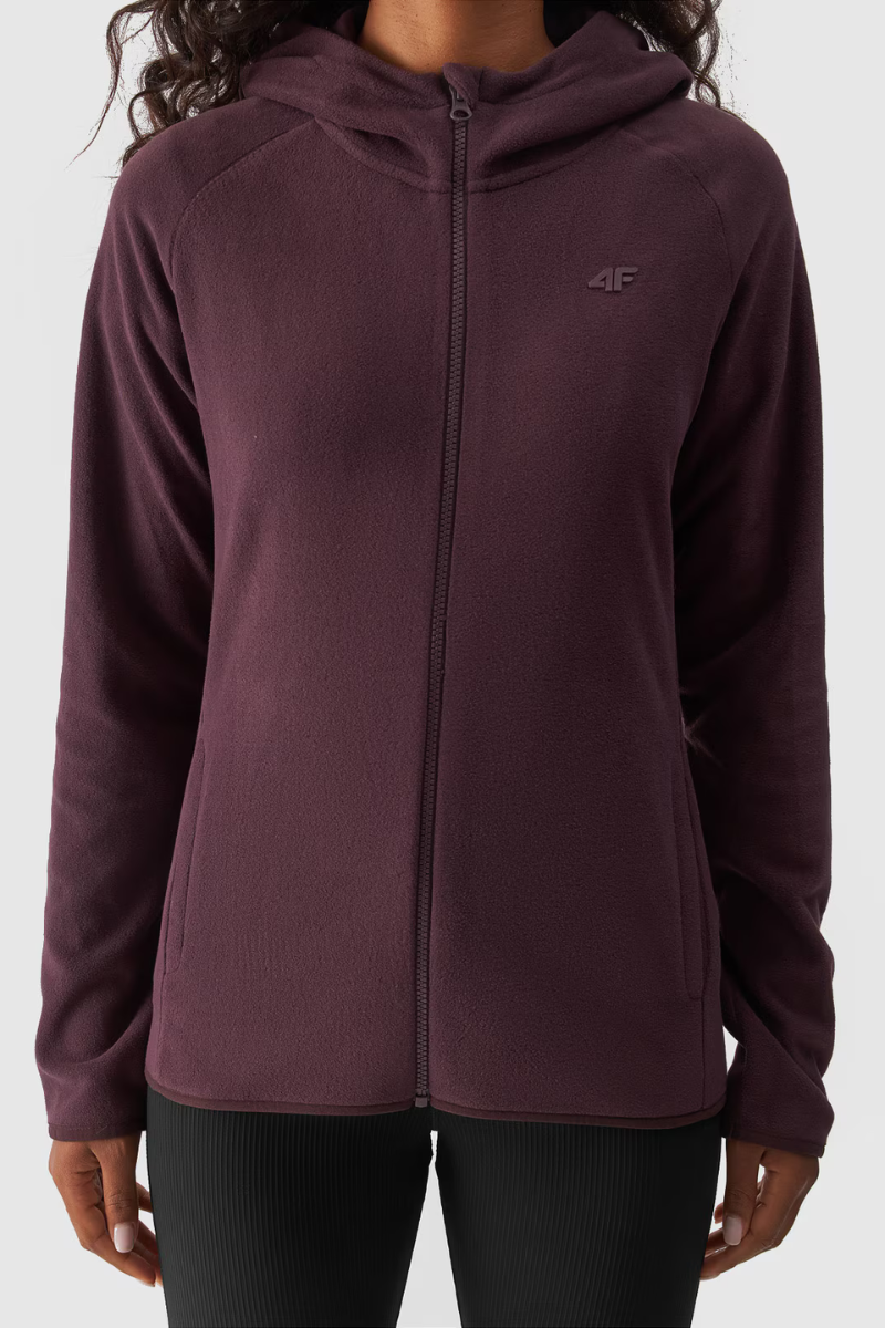 Bluza damska jest wykonana z gładkiego i miękkiego w dotyku polaru, który cechuje się bardzo dobrą izolacją termiczną, a przy tym oddycha i szybko schnie. Technologia 4FWarm wspiera komfort cieplny. Ciepły polar damski posiada stójkę z nieodpinanym kapturem bez regulacji. Mankiety zakończone elastyczną lamówką. Po bokach znajdują się 2 kieszenie otwarte. Zapinany na jednokierunkowy zamek główny. Raglanowe rękawy nie ograniczają ruchów. Materiał główny: Poliester 100% Podszewka: Bawełna 60%, Poliester 40%
