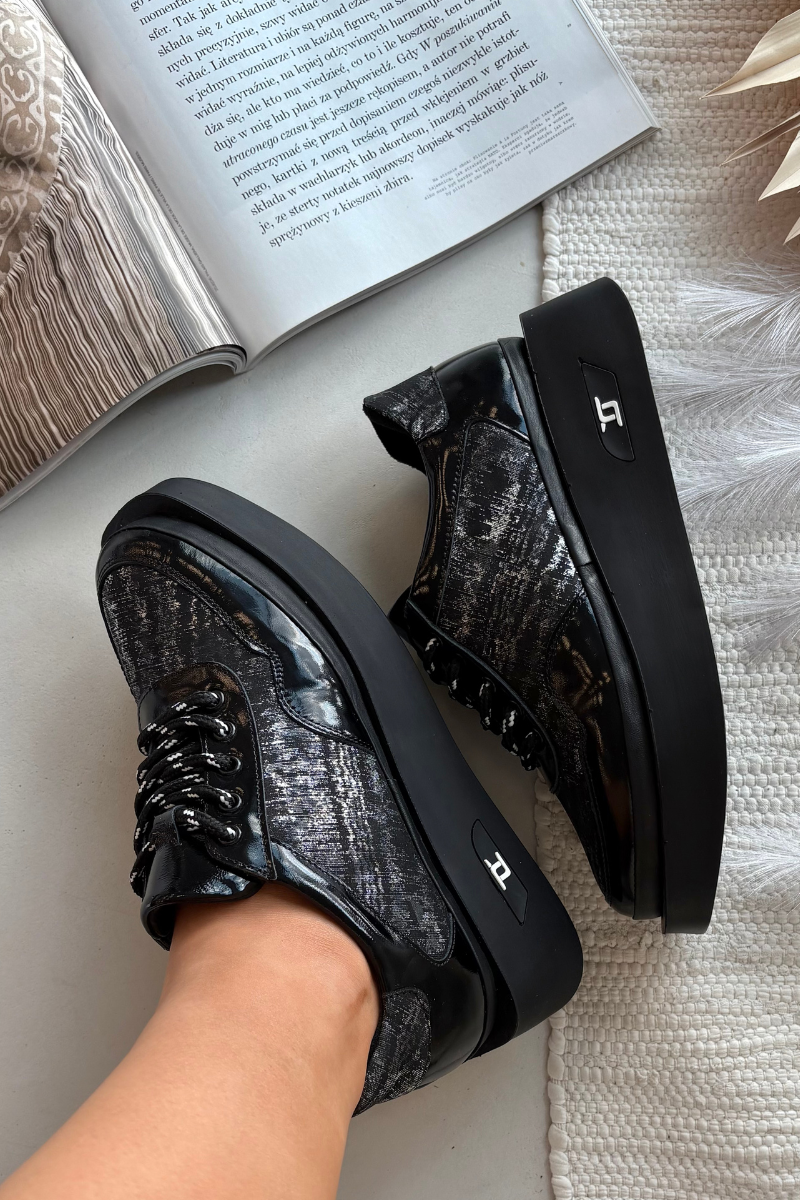 Półbuty Damskie Skóra Naturalna Sznurowanie Platforma Czarno-Srebrne Artiker 57C2043