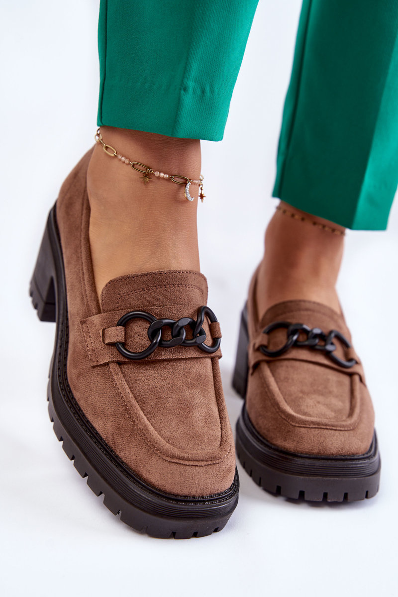Półbuty idealnie sprawdzą się w sezonie jesiennym. Buty te pasują zarówno do eleganckich, jak i casualowych stylizacji. Klasyczne półbuty powinny znaleźć się w Twojej szafie! Wykonane z ekologicznego zamszu. Na przodzie posiadają ozdobny łańcuch. Stabilny, masywny obcas sprawi, że będziesz czuć się pewnie na każdym kroku. Miękka wkładka z naturalnej skóry to gwarancja komfortu przez cały dzień! Świetny model na spacery, do pracy czy spotkanie ze znajomymi.