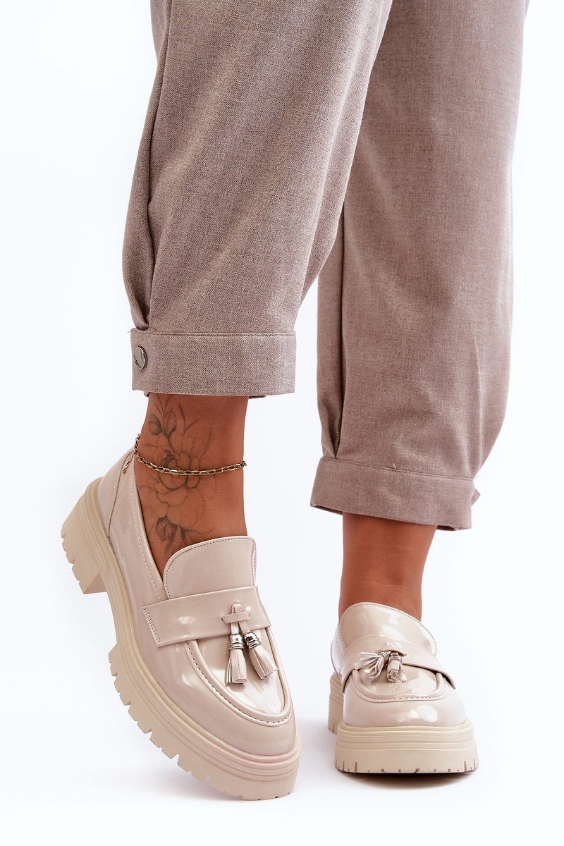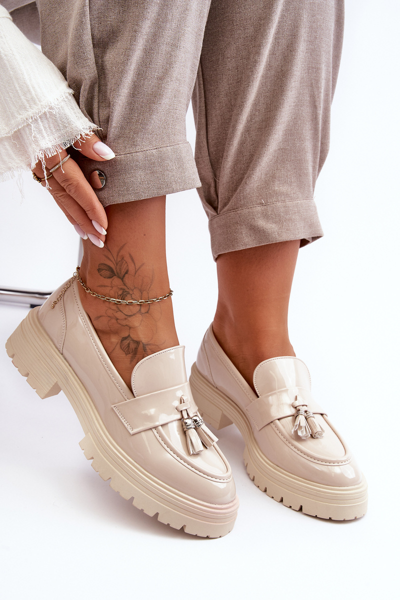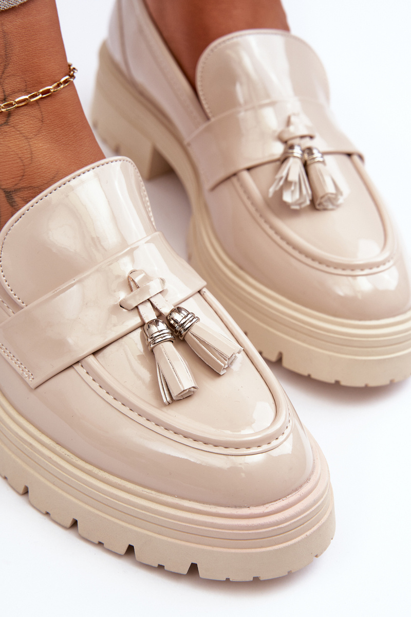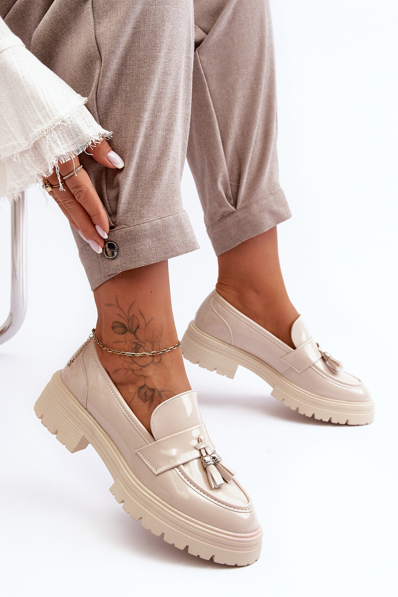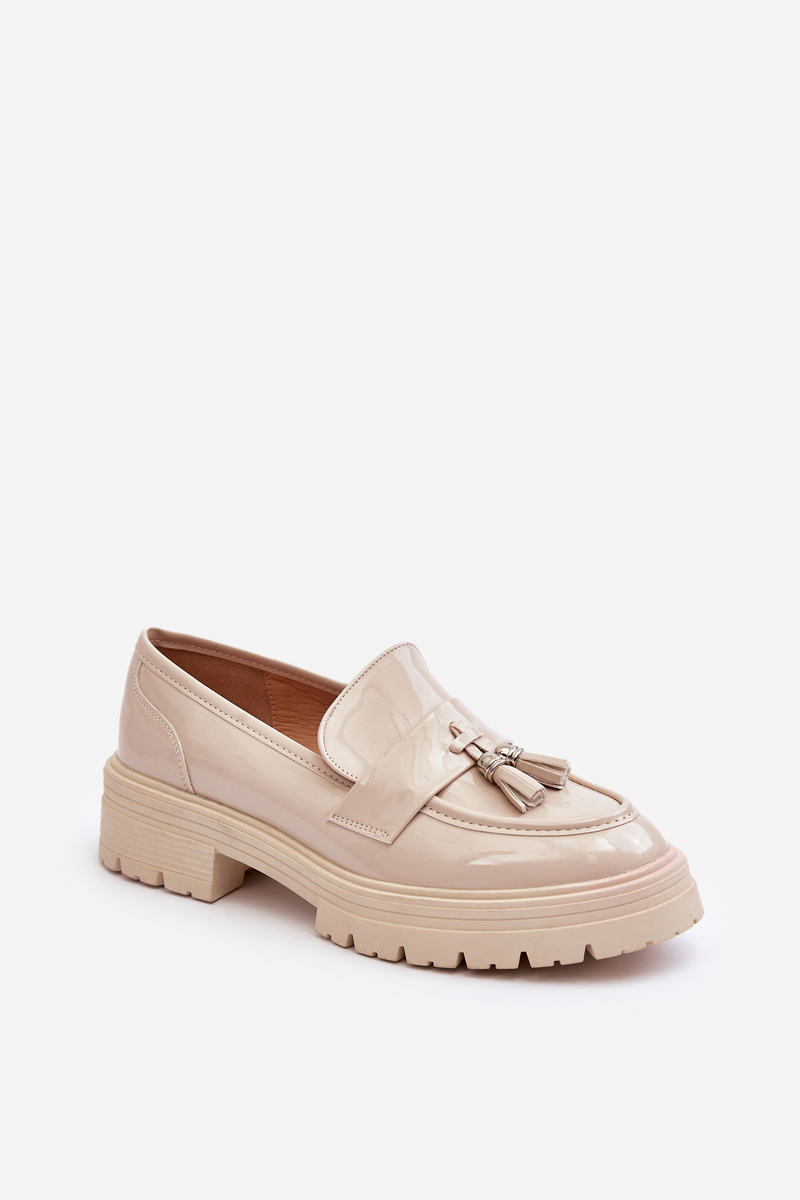 Półbuty Loafersy Lakierowane Z Frędzlami Jasnobeżowe Velenase YL189