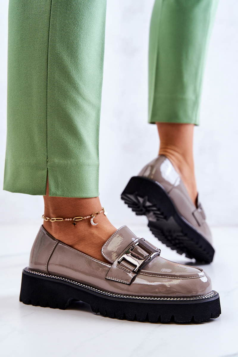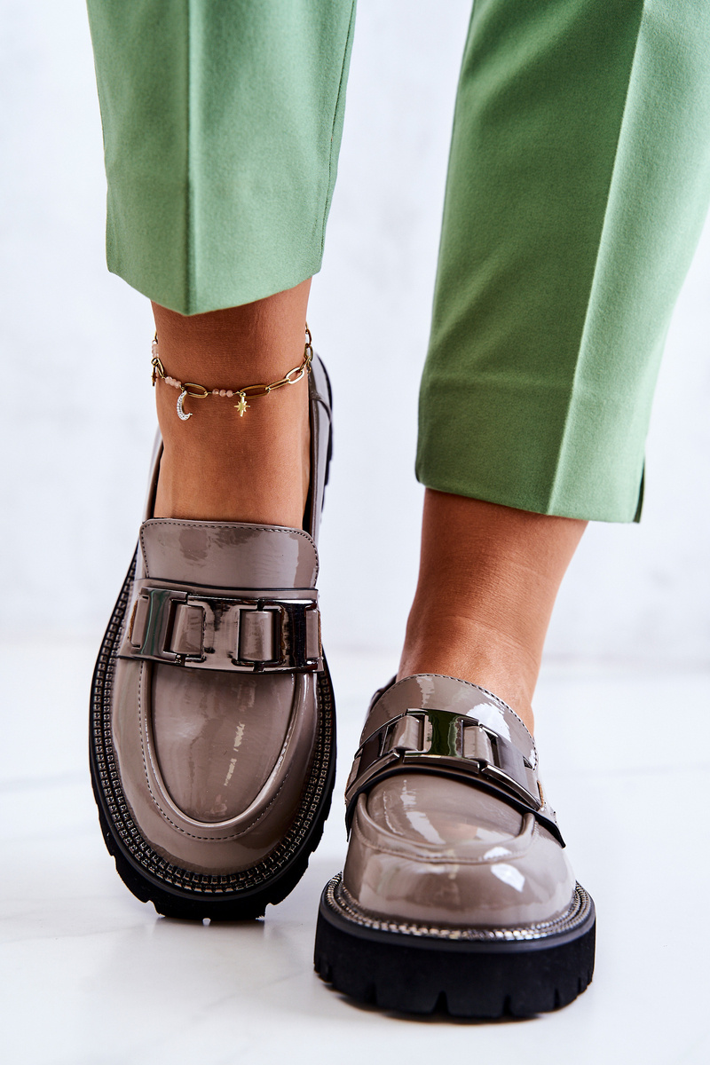 Półbuty Loafery Lakierowane Skórzane Szare Corine