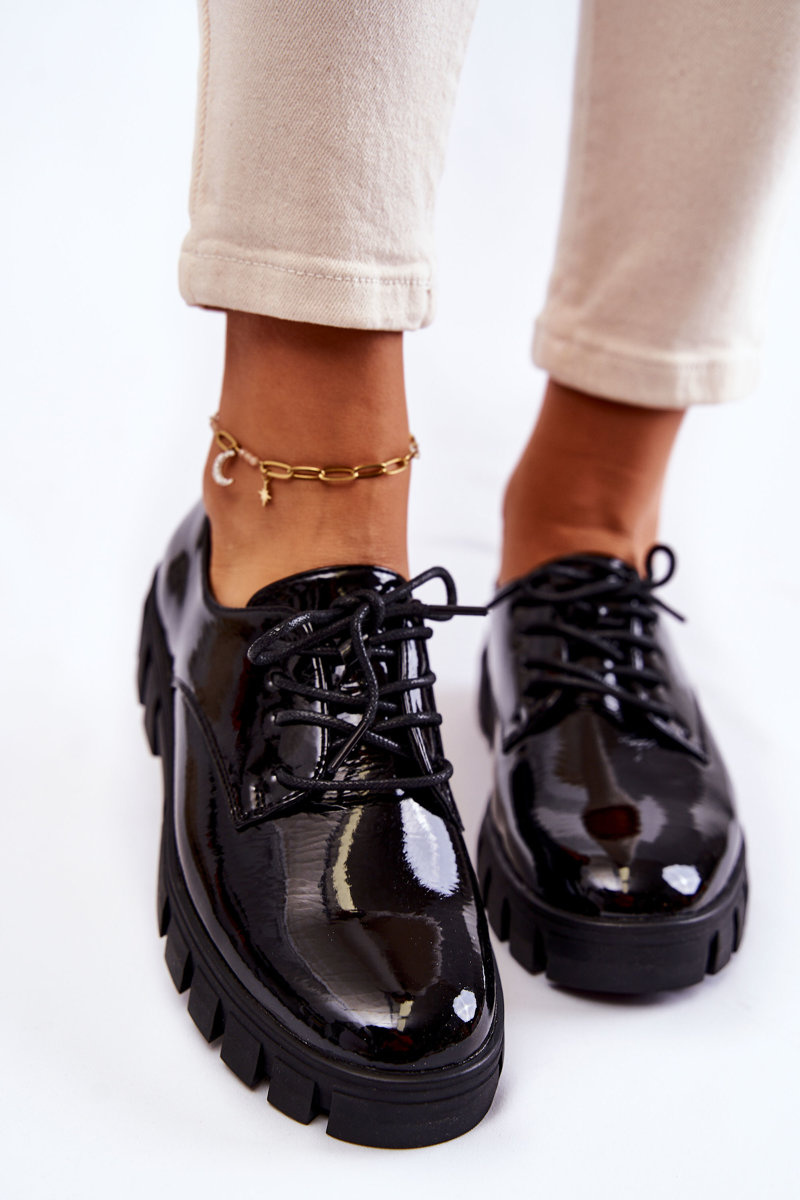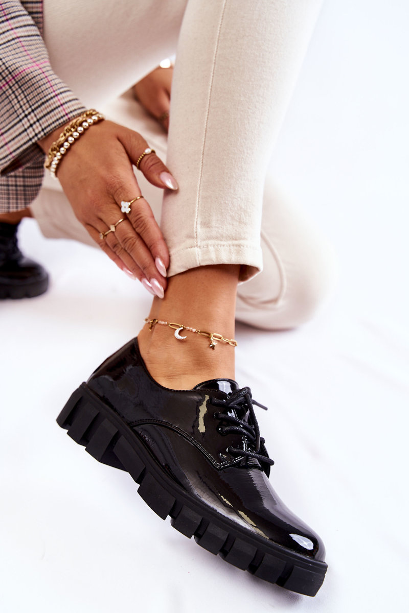 Półbuty Modne Lakier Wiązane Czarne Gwendy