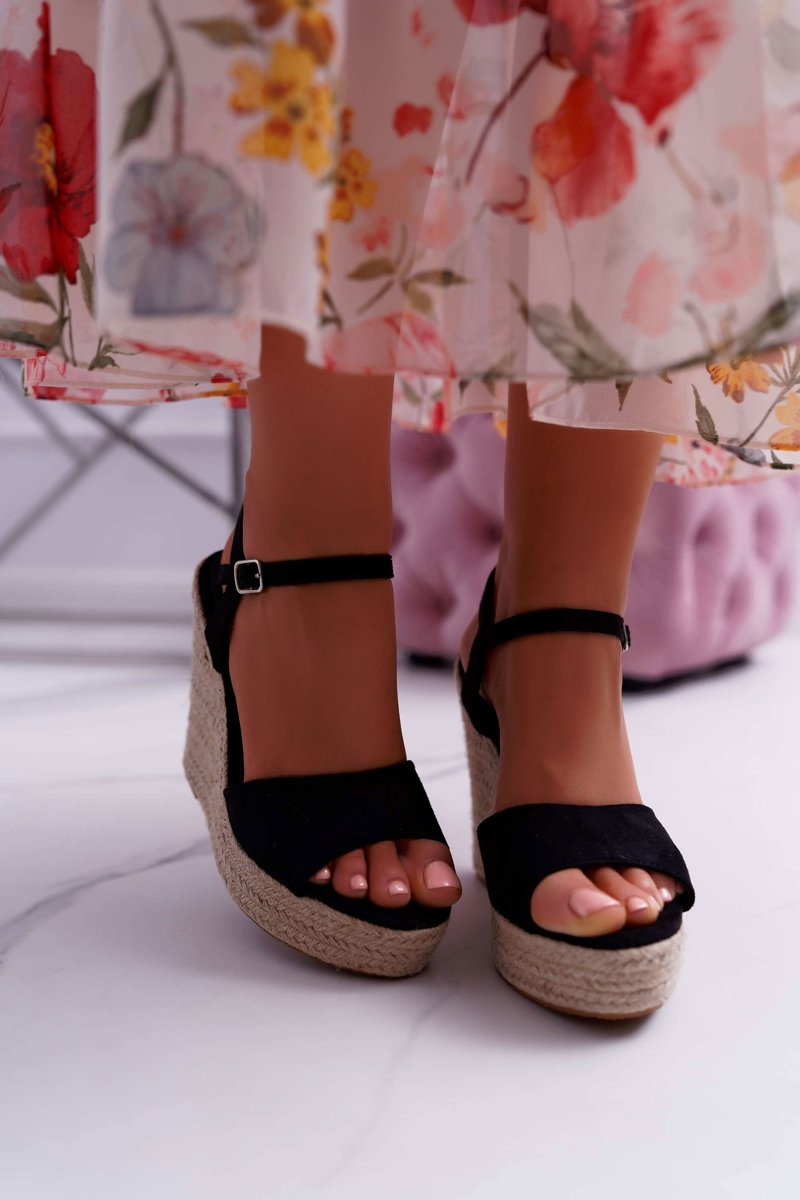Sandały Damskie Na Koturnie Lniane Czarne Girenn