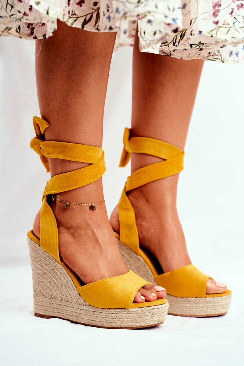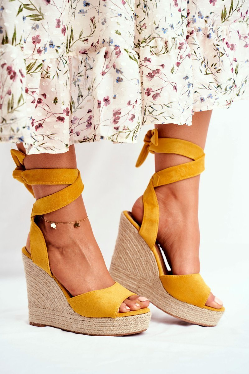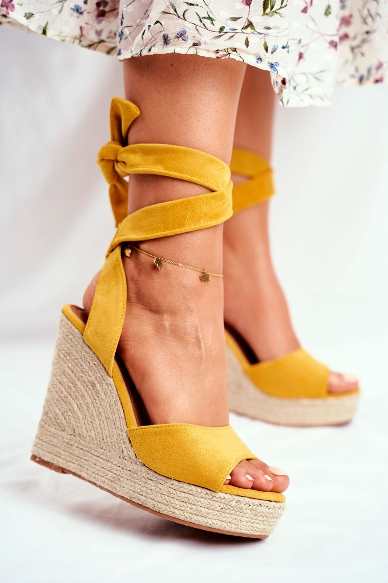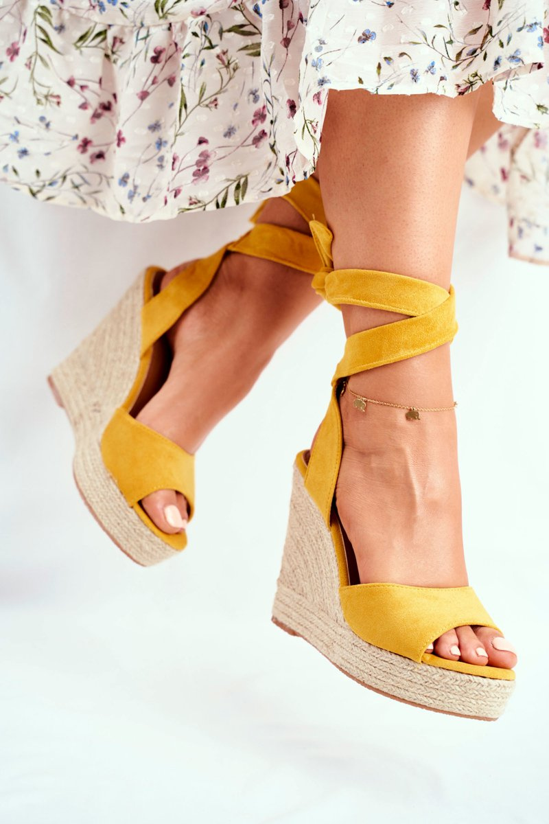 Sandały Damskie Na Koturnie Wiązane Żółte Belleza