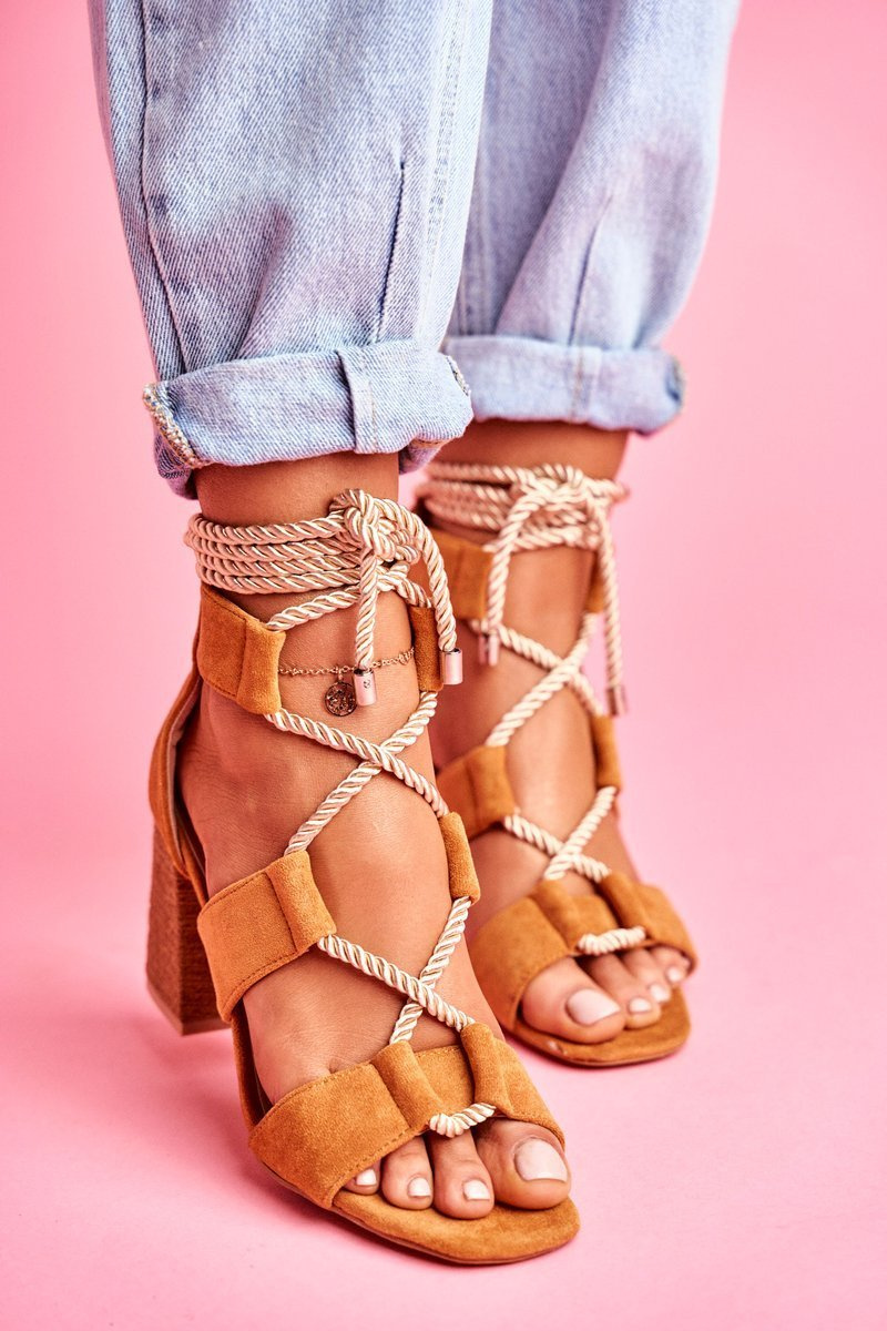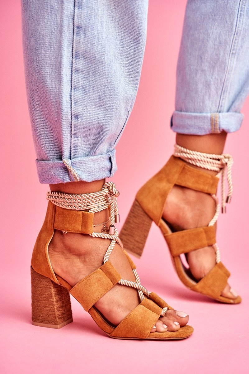 Sandały Damskie Na Słupku Wiązane Zamszowe Camel Amore