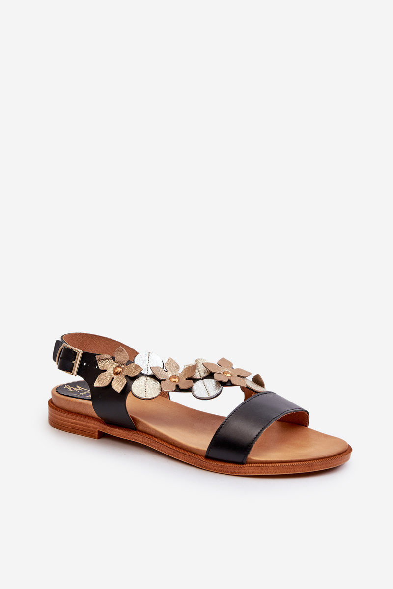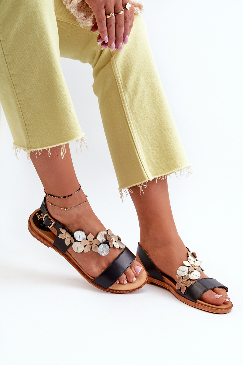 Sandały Damskie Skóra Naturalna Ozdobione Kwiatkami Czarne Laura Messi 2762
